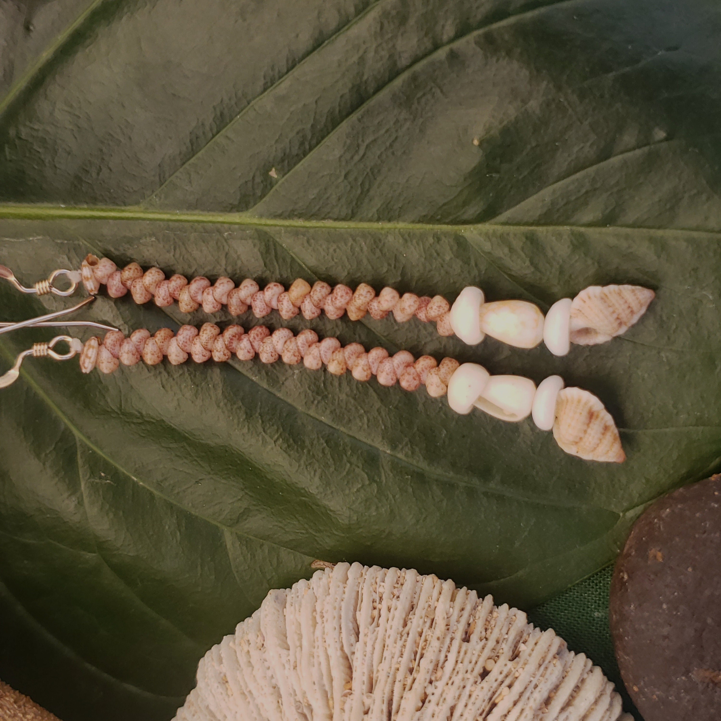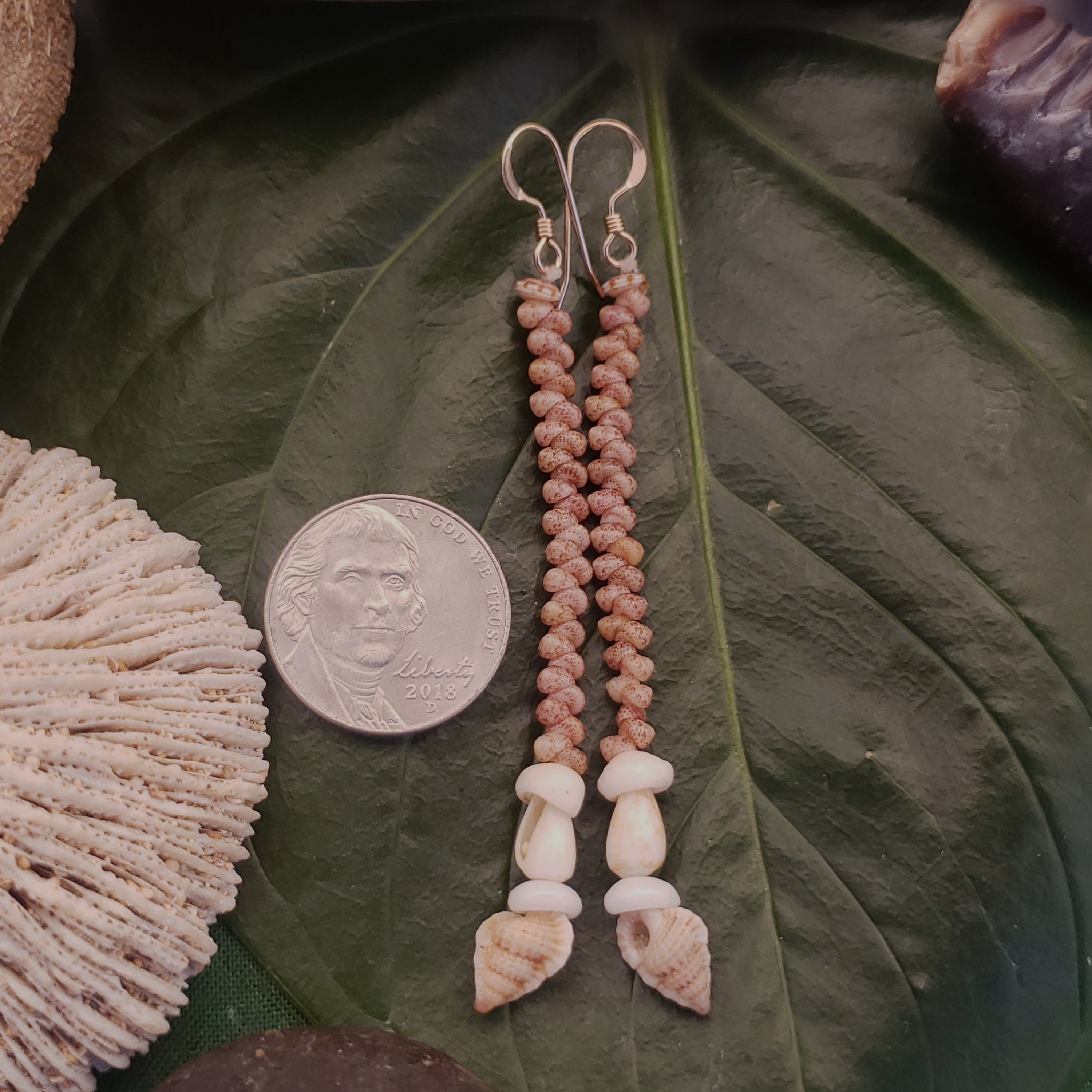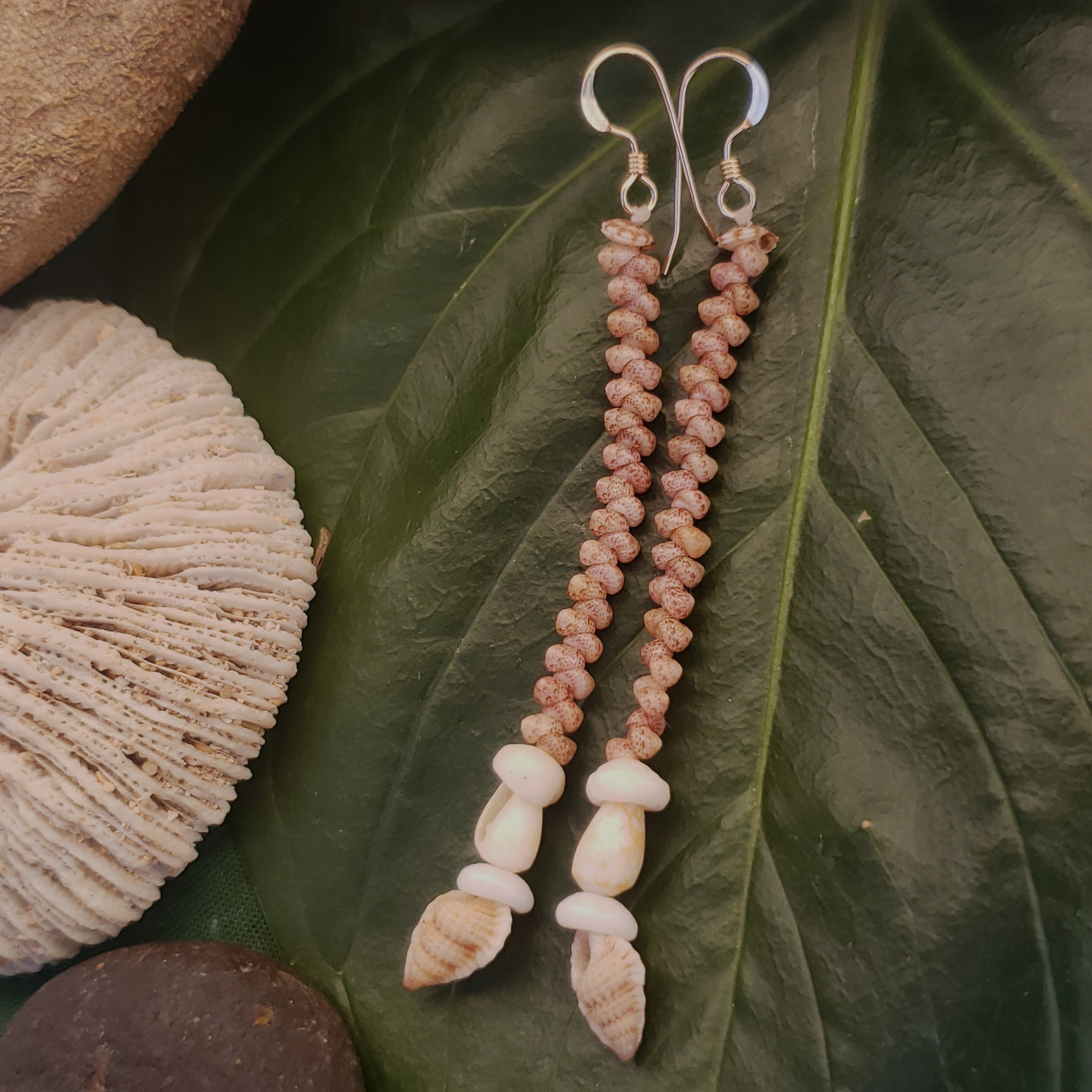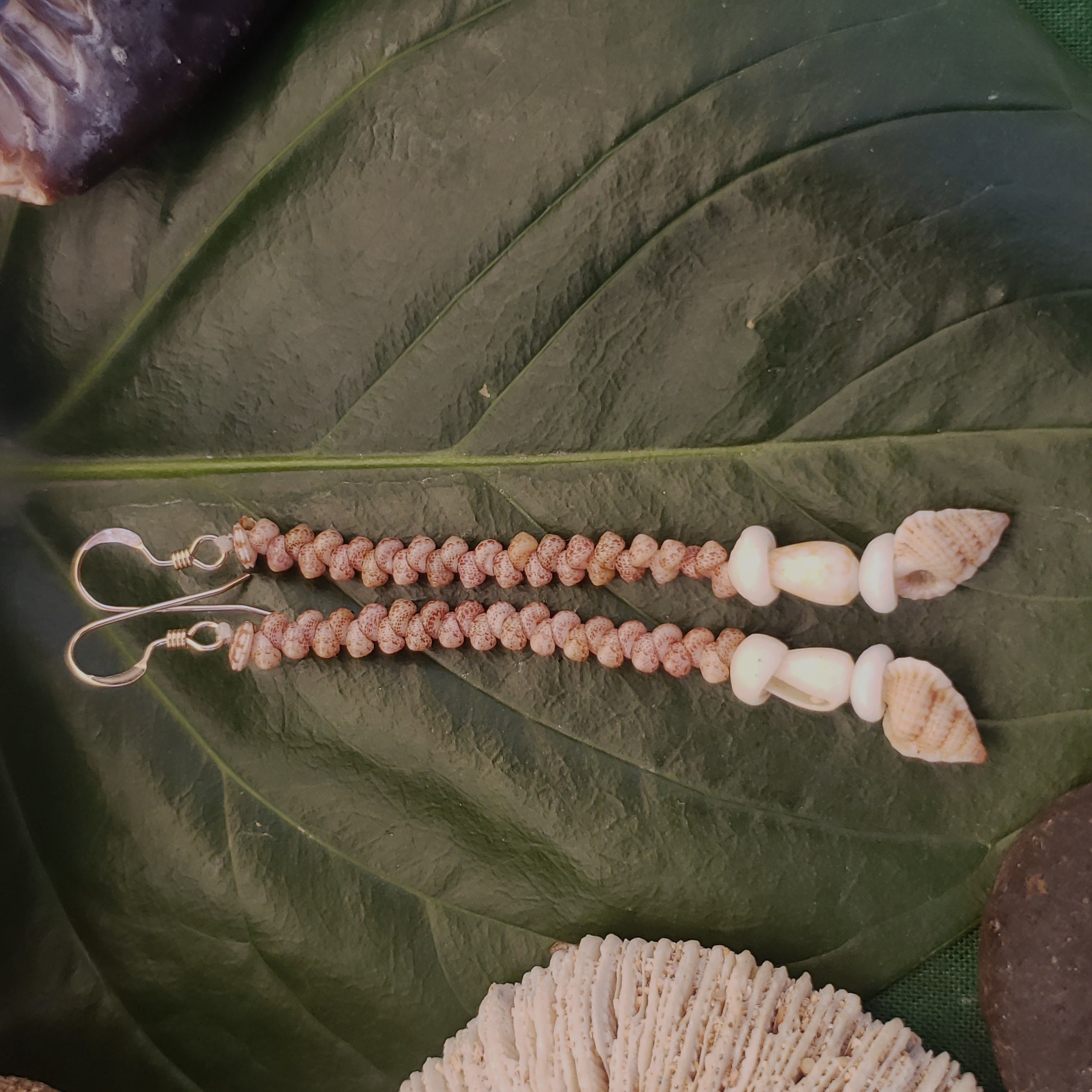 These sea shell earrings are made using the Kahelelani shells a very rare and valuable shell, with tiny triton shells and puka shells. Each shell has been hand picked from the beaches of the garden island Kauai, Hawaii. The tiny triton shells used in these earrings are very prized and hard to find.