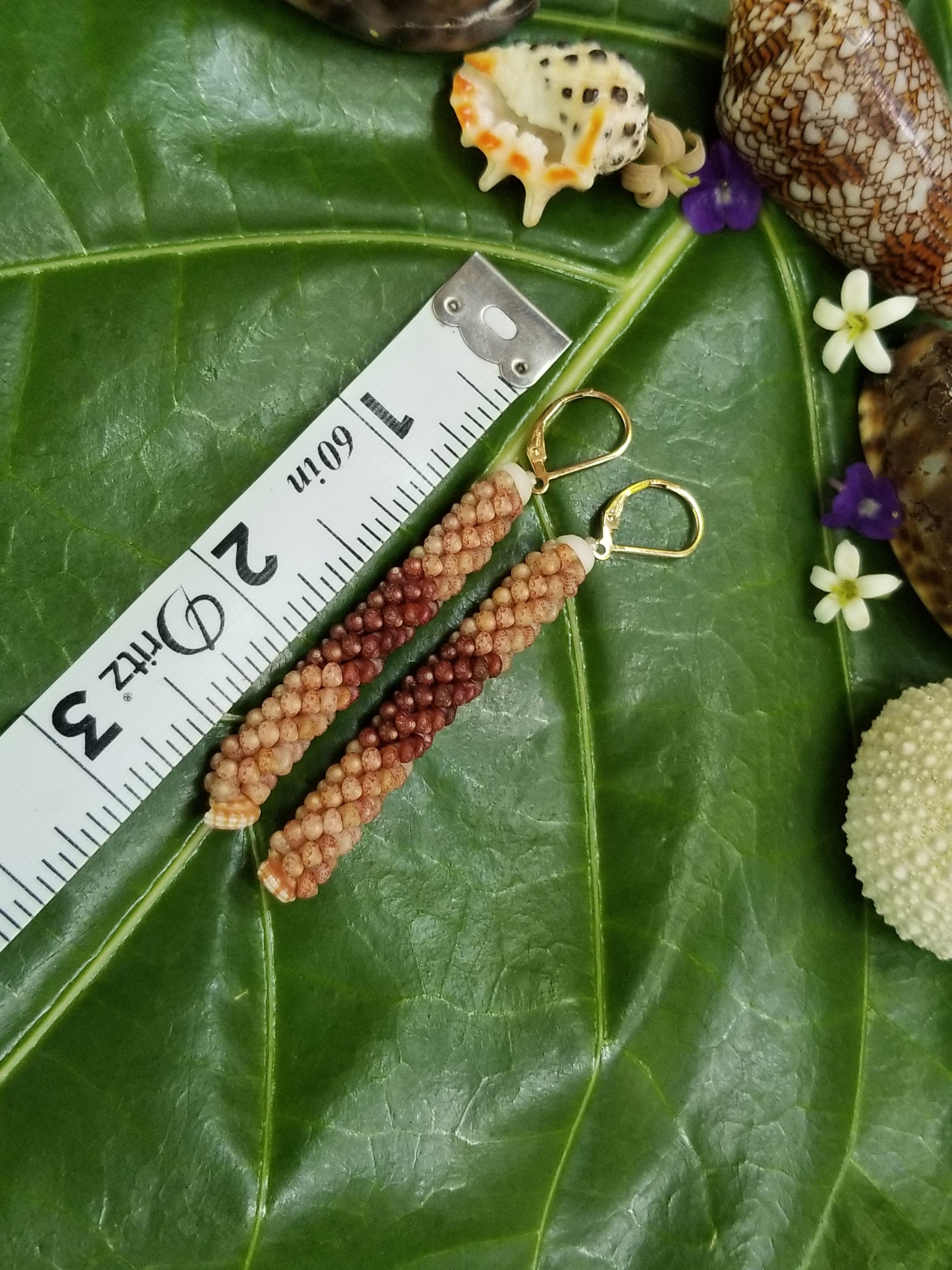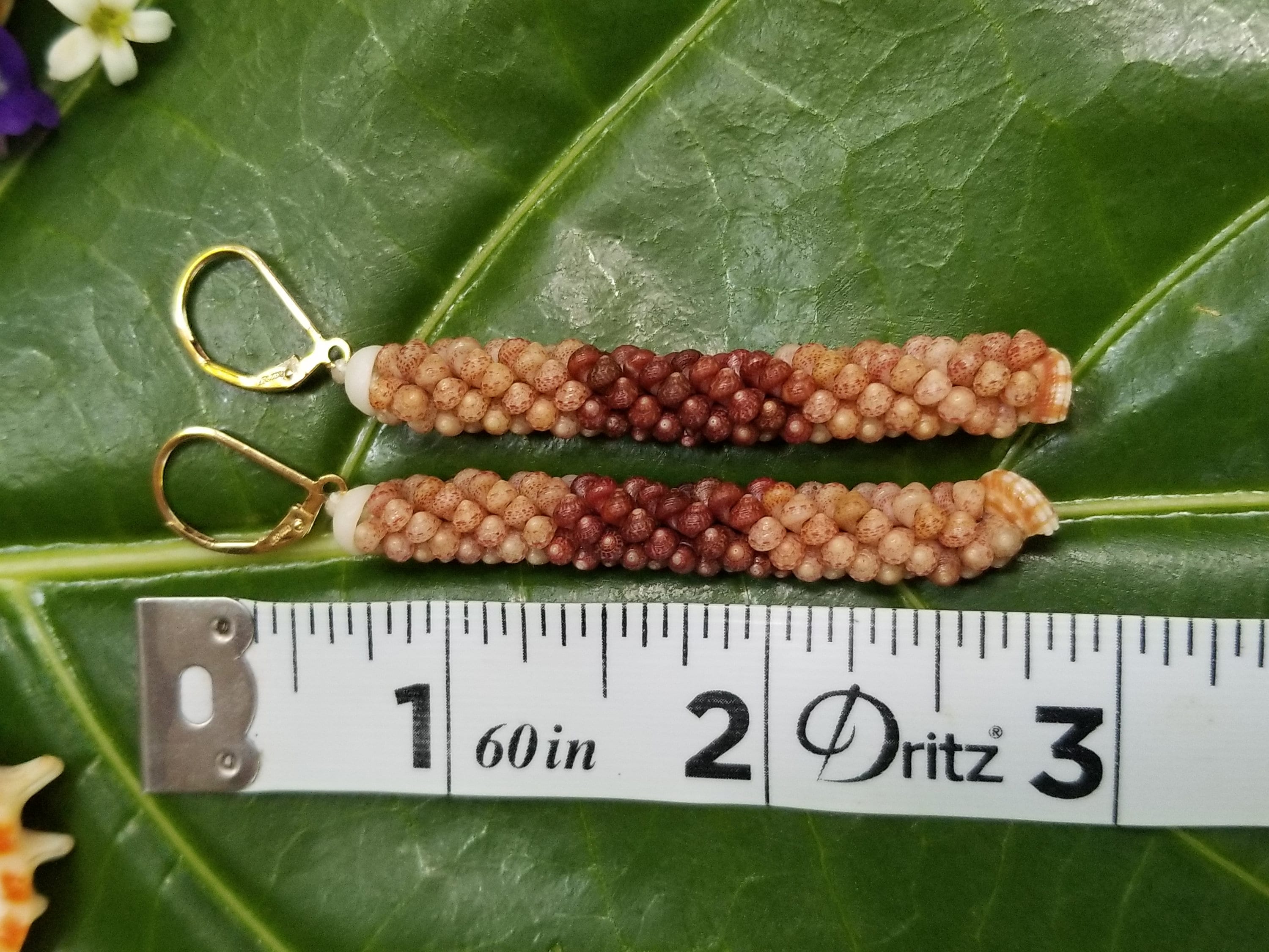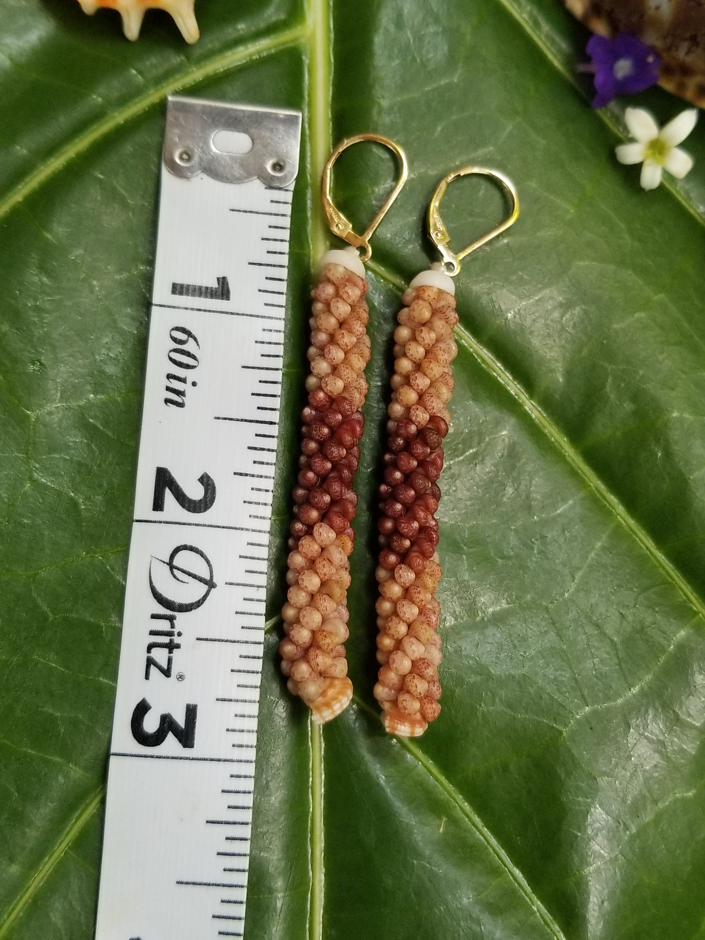 These sea shell earrings are made using the Kahelelani shells, white drupe shells and puka shells, very rare and valuable shells. Each shell has been hand picked from the beaches of the north shores of the garden island Kauai, Hawaii. The shells used in these earrings are very prized and hard to find.