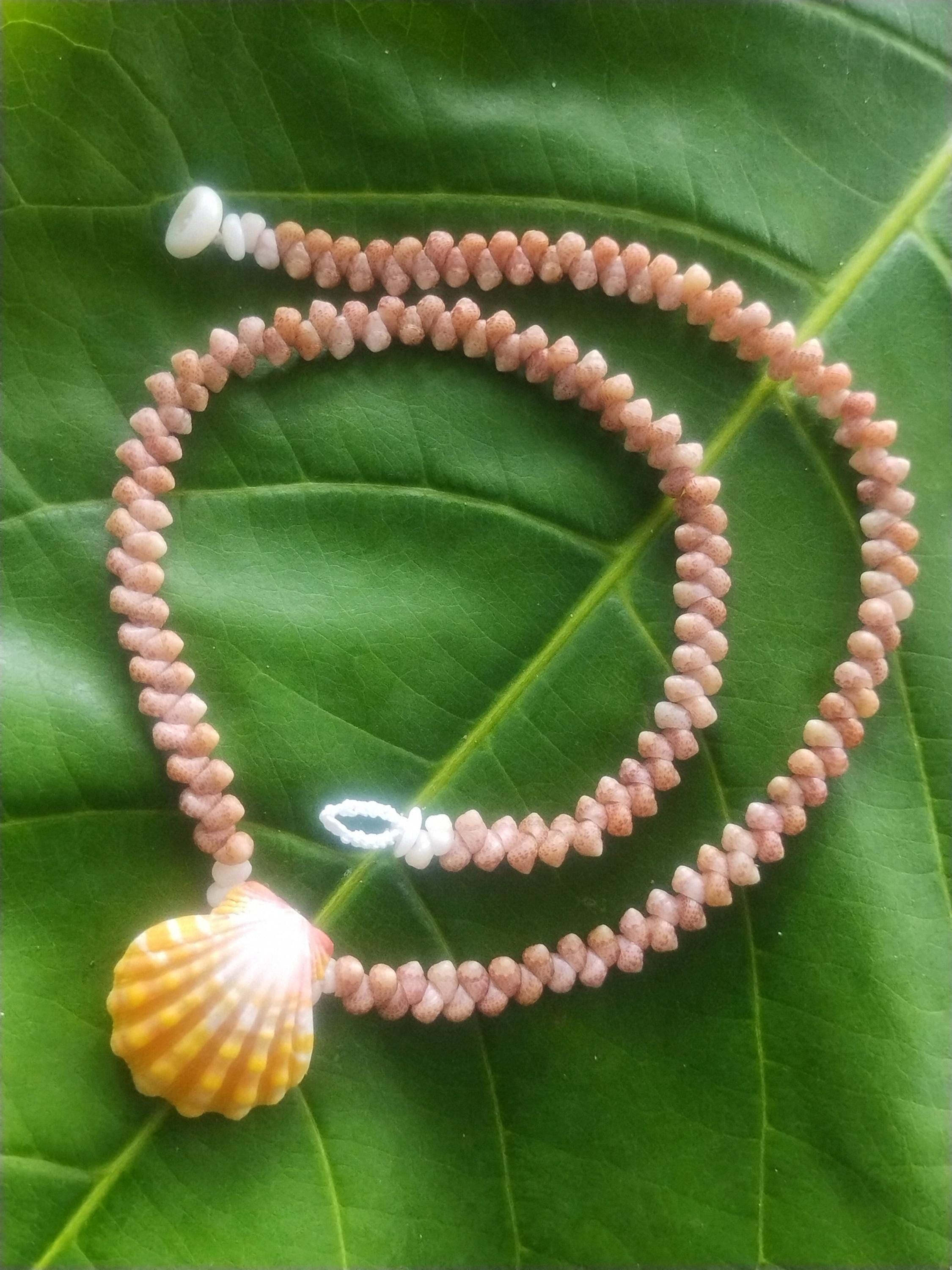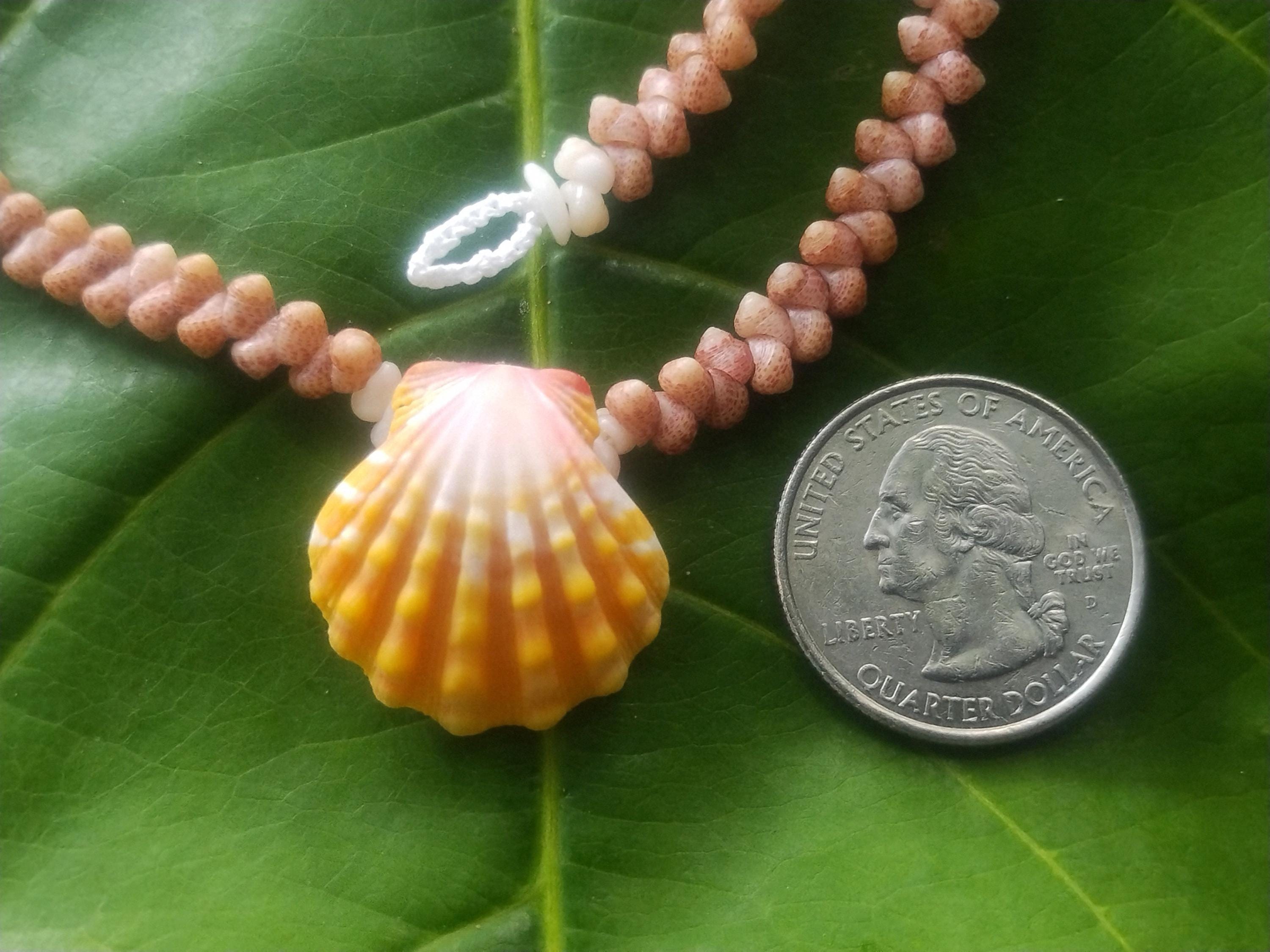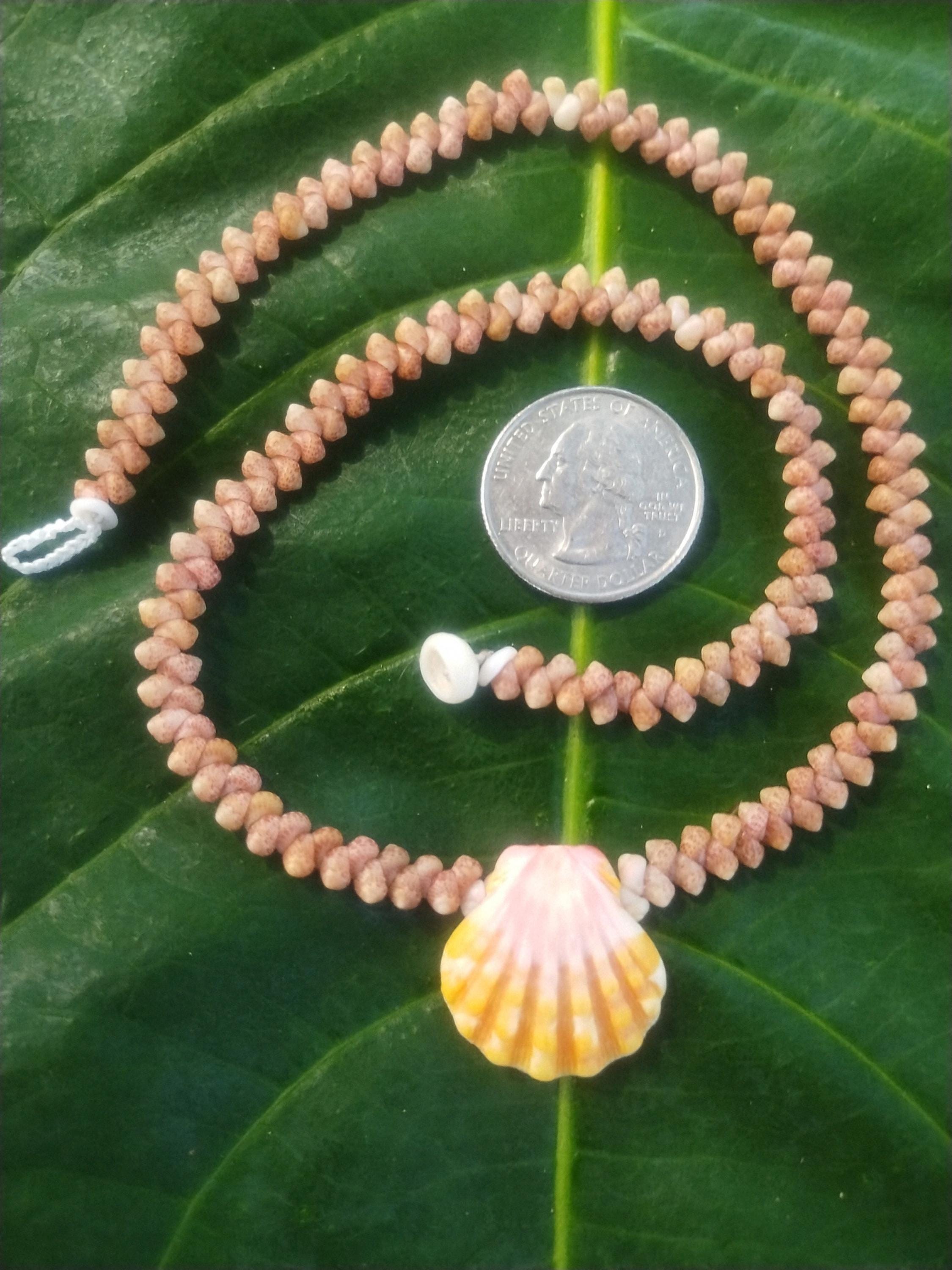 This classic Hawaiian Sunrise Shell is very high quality with strong ridges and both it's wings in tact. The colors on this shell are 100% natural, just as it was found on the shores of Kauai, Hawaii. The Sunrise shells and the Kahelelani shells were only worn by the royalty in the old Hawaiian days and were highly regarded for their beauty and rarity. Today they are extremely hard to find, being one of the most sought after and valuable shells in the ocean. This traditional Ni'ihau herringbone design is very versatile, comfortable, and durable.