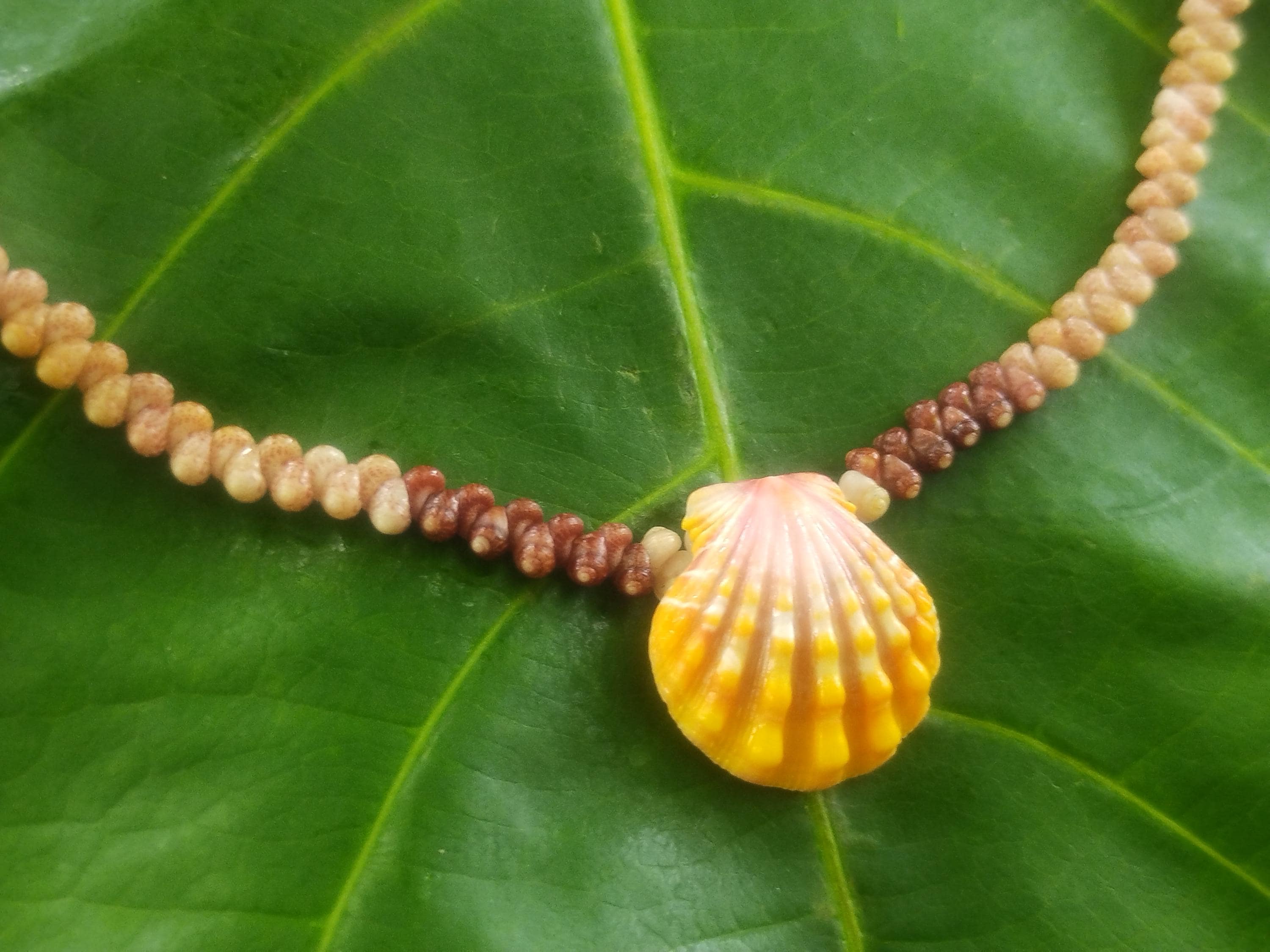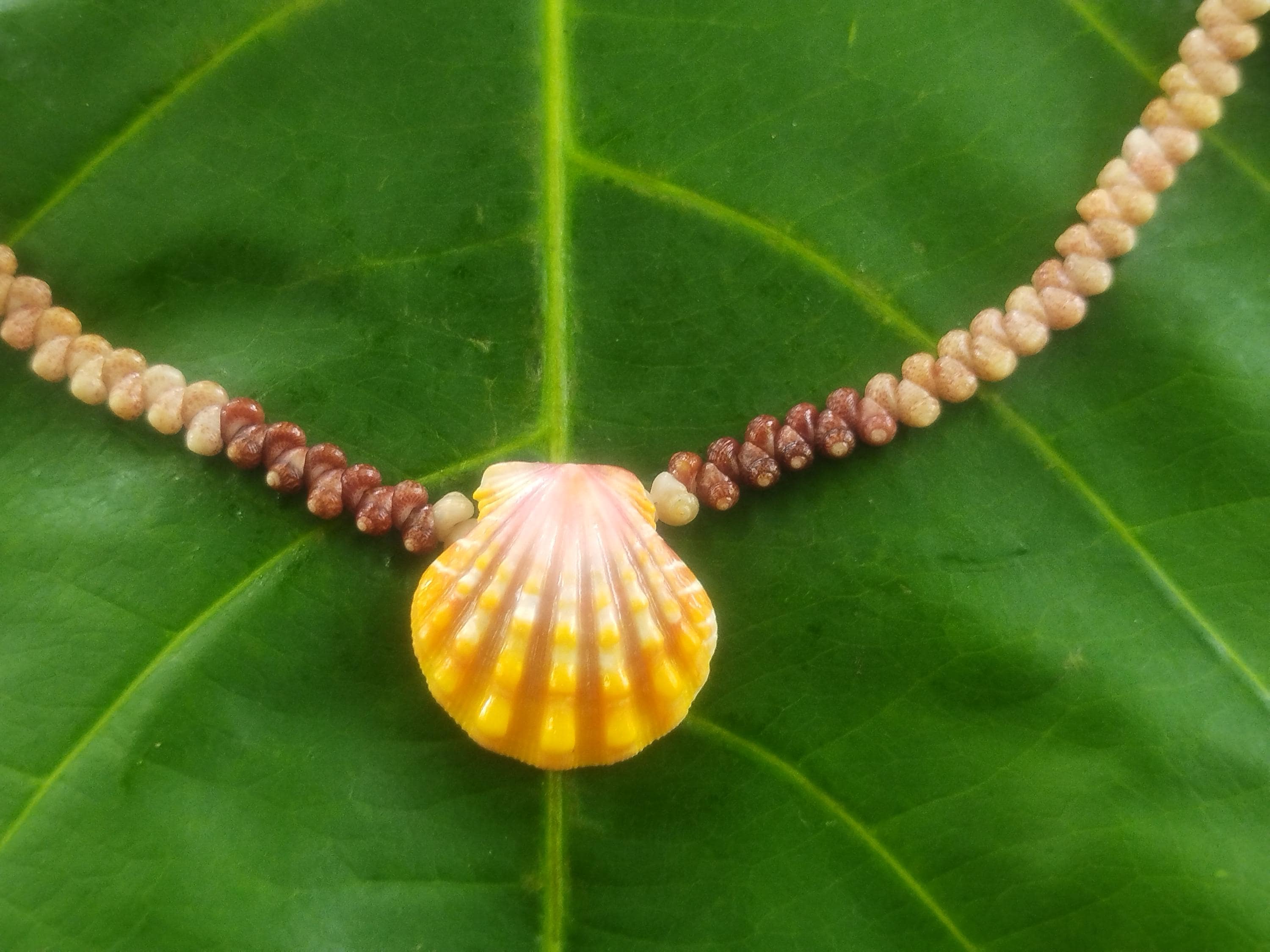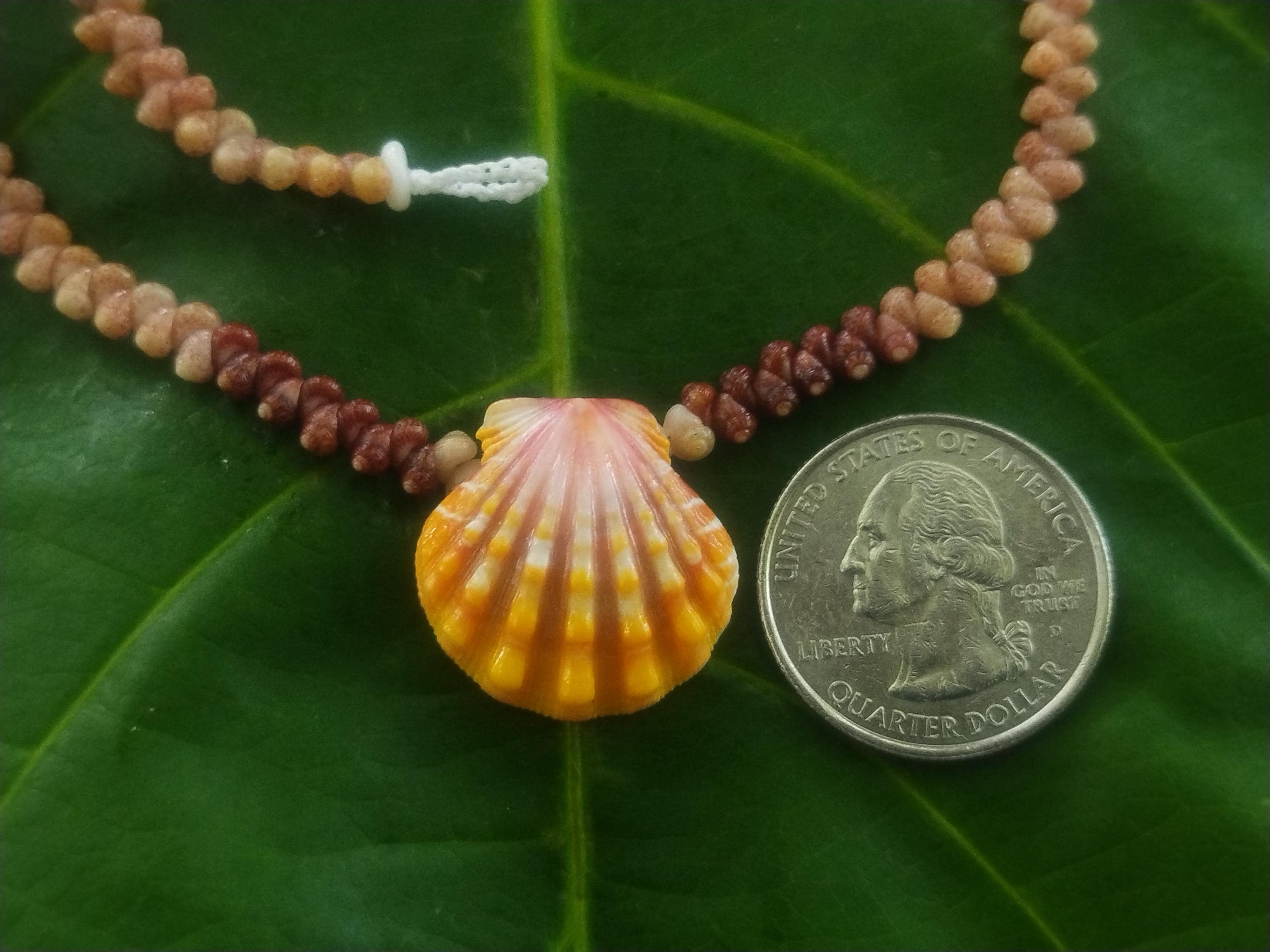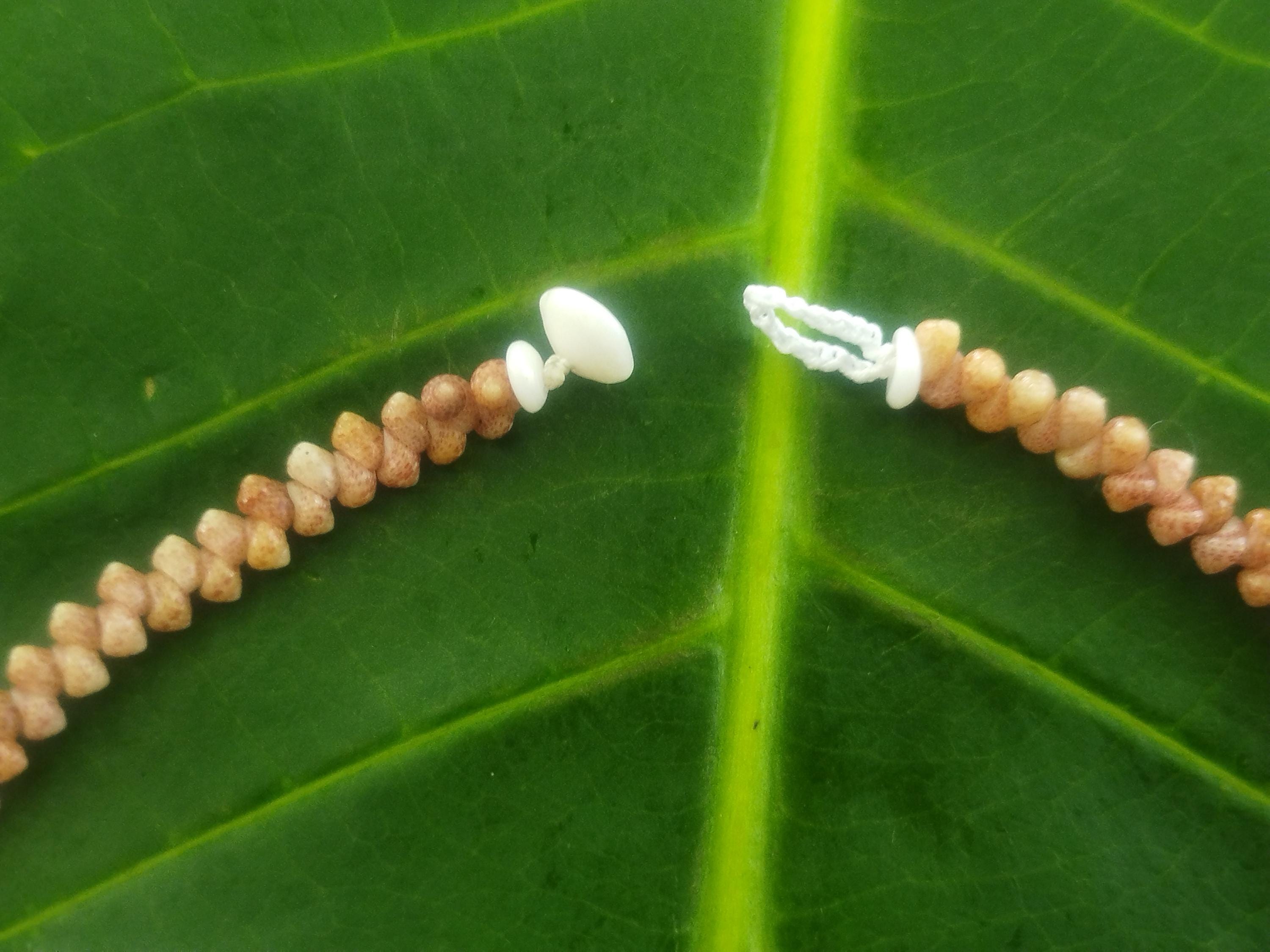 This classic Hawaiian Sunrise Shell is very high quality with strong ridges and both it's wings in tact. The colors on this shell are 100% natural, just as it was found on the shores of Kauai, Hawaii. The Sunrise shells and the Kahelelani shells were only worn by the royalty in the old Hawaiian days and were highly regarded for their beauty and rarity. Today they are extremely hard to find, being one of the most sought after and valuable shells in the ocean. This traditional Ni'ihau herringbone design is very versatile, comfortable, and durable.