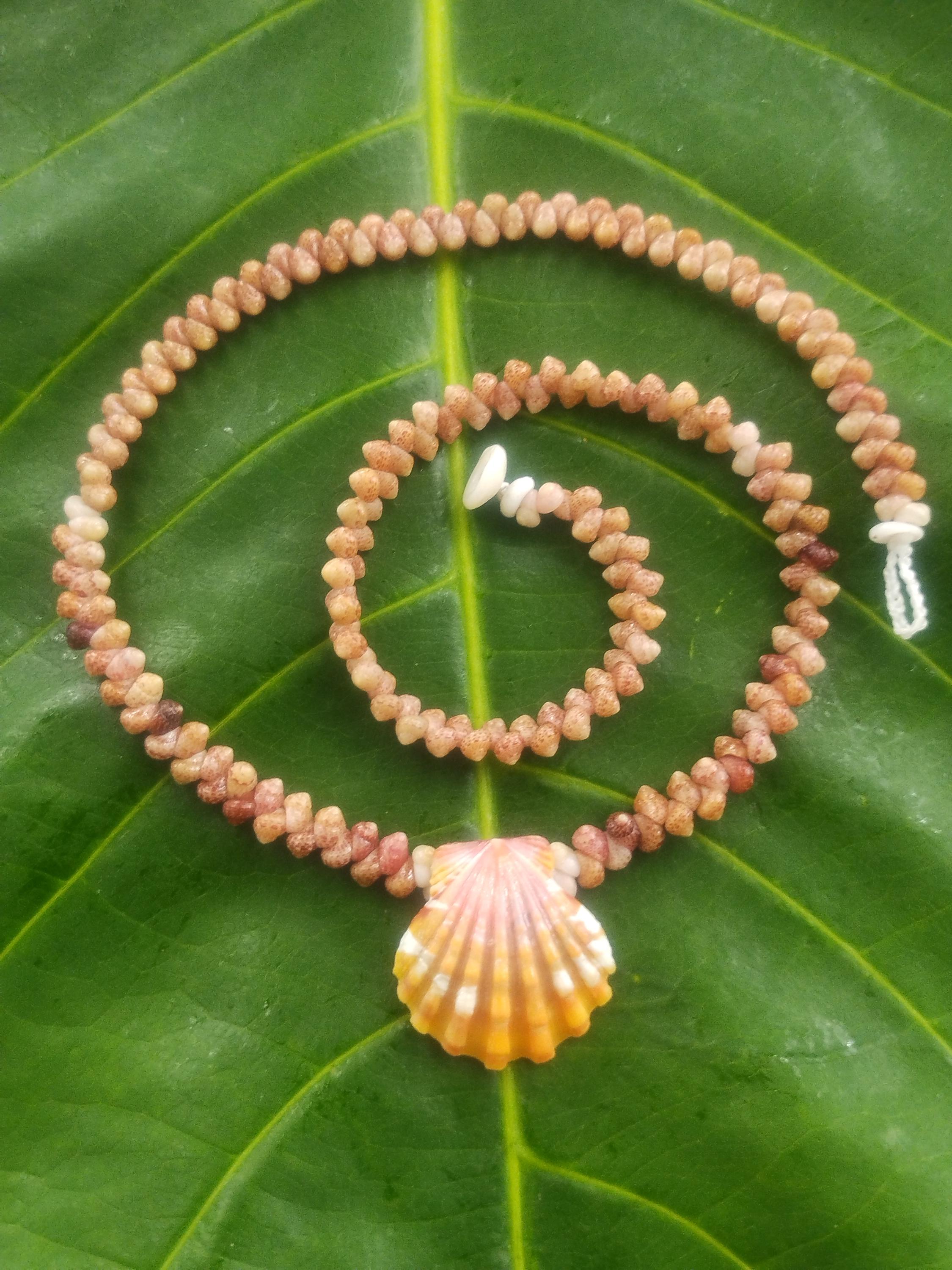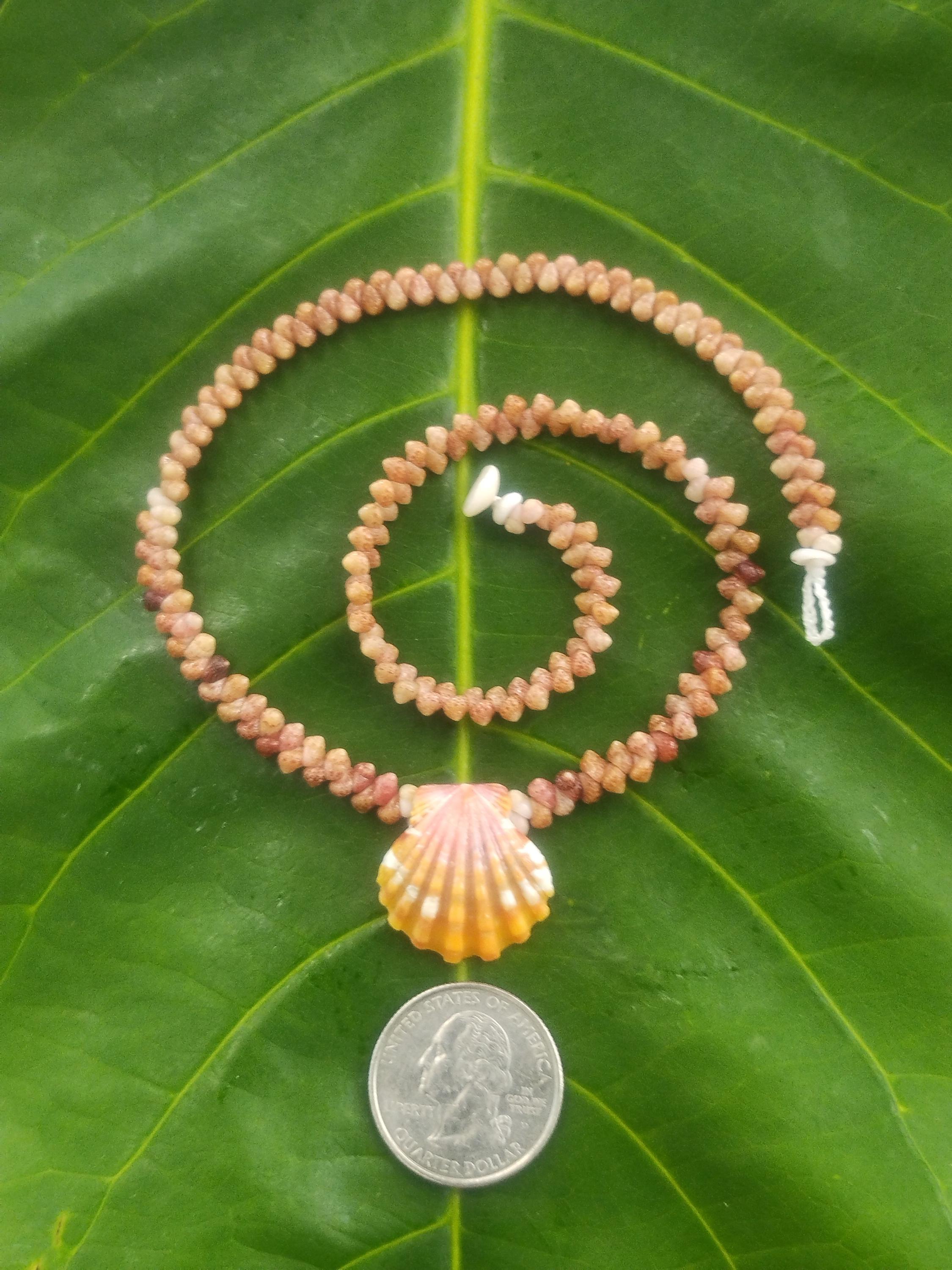 This classic Hawaiian Sunrise Shell is very high quality with strong ridges and both it's wings in tact. The colors on this shell are 100% natural, just as it was found on the shores of Kauai, Hawaii. The Sunrise shells and the Kahelelani shells were only worn by the royalty in the old Hawaiian days and were highly regarded for their beauty and rarity. Today they are extremely hard to find, being one of the most sought after and valuable shells in the ocean. This traditional Ni'ihau herringbone design is very versatile, comfortable, and durable.