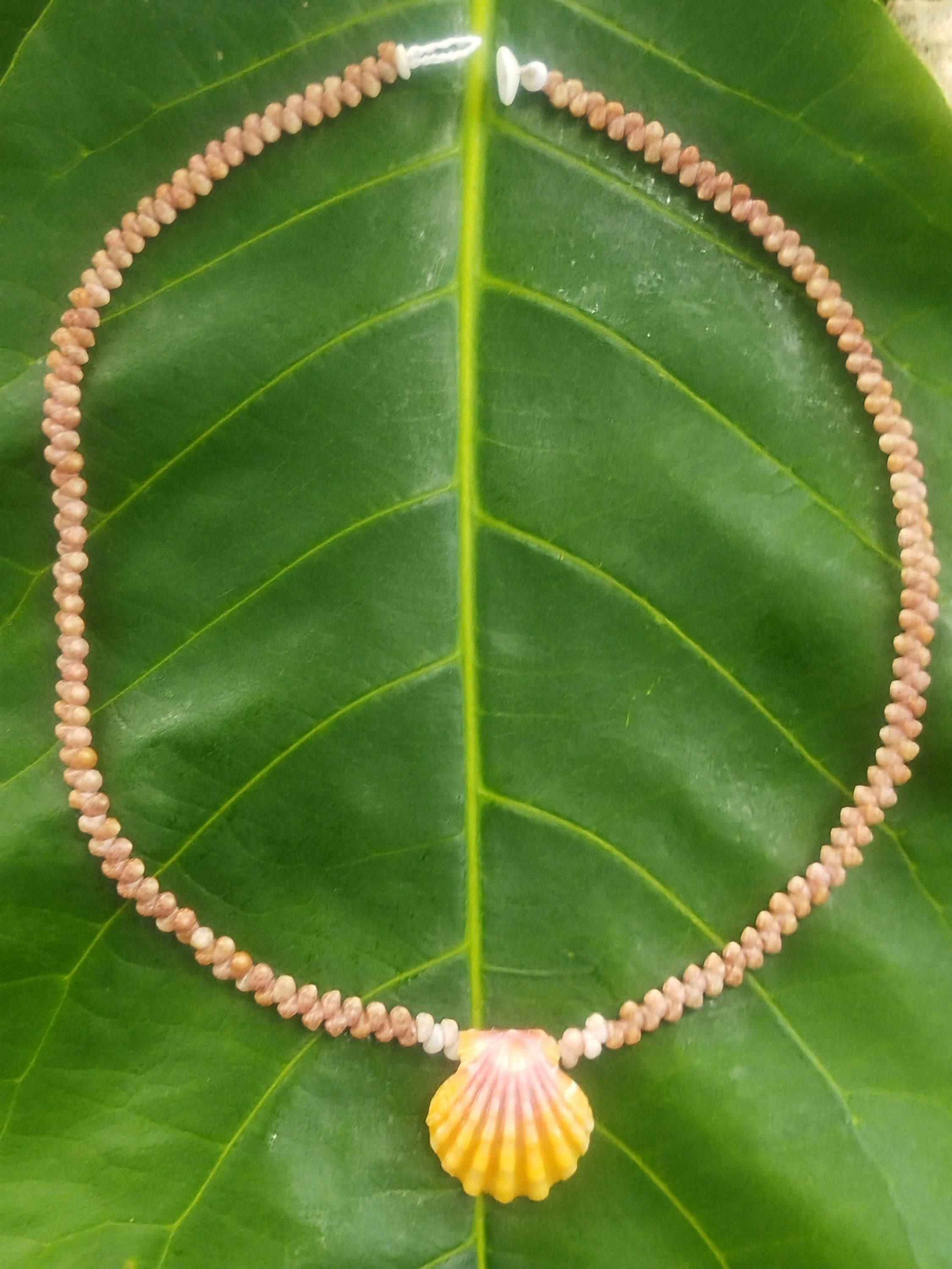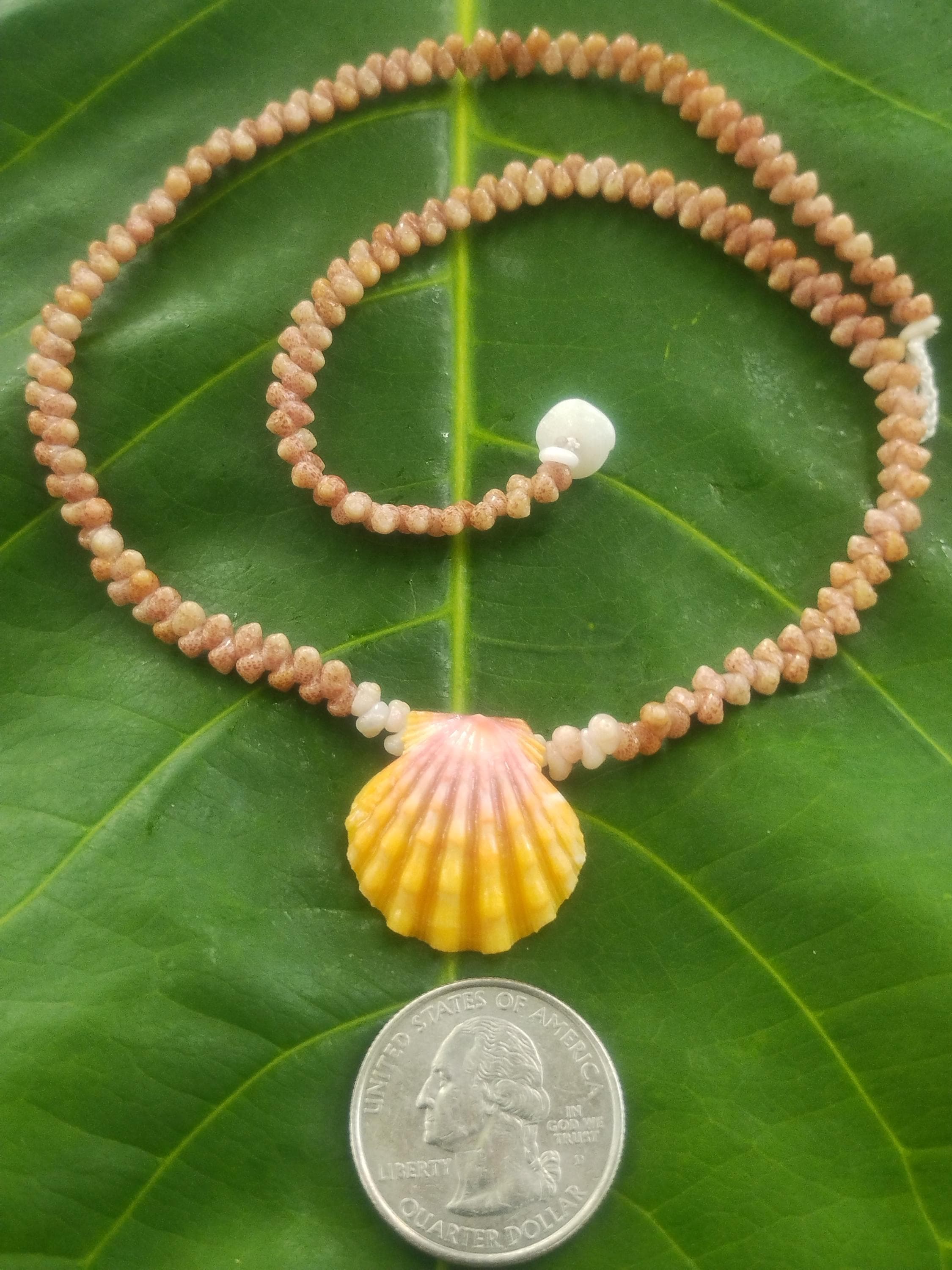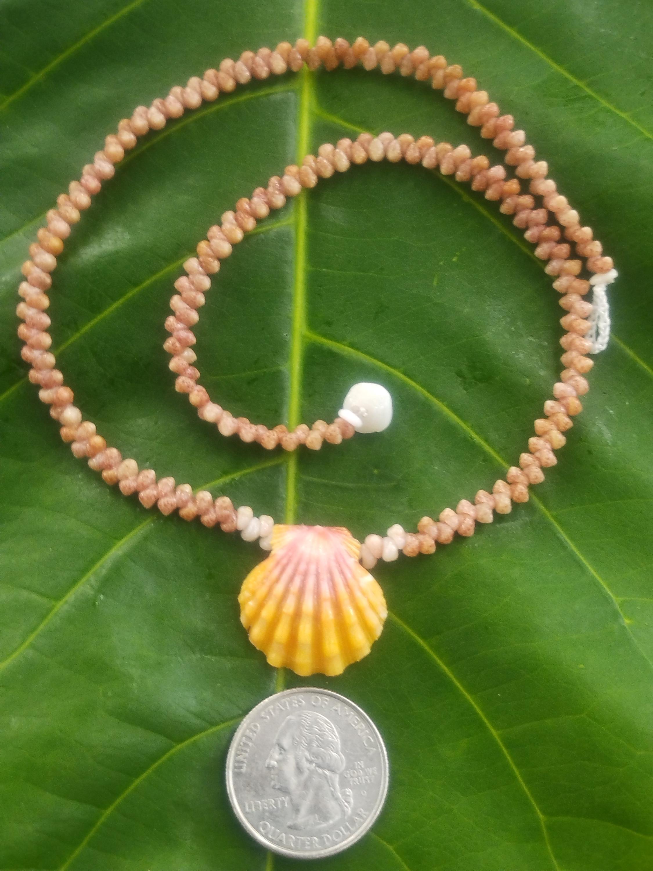 This classic Hawaiian Sunrise Shell is very high quality with strong ridges and both it's wings in tact. The colors on this shell are 100% natural, just as it was found on the shores of Kauai, Hawaii. The Sunrise shells and the Kahelelani shells were only worn by the royalty in the old Hawaiian days and were highly regarded for their beauty and rarity. Today they are extremely hard to find, being one of the most sought after and valuable shells in the ocean. This traditional Ni'ihau herringbone design is very versatile, comfortable, and durable.