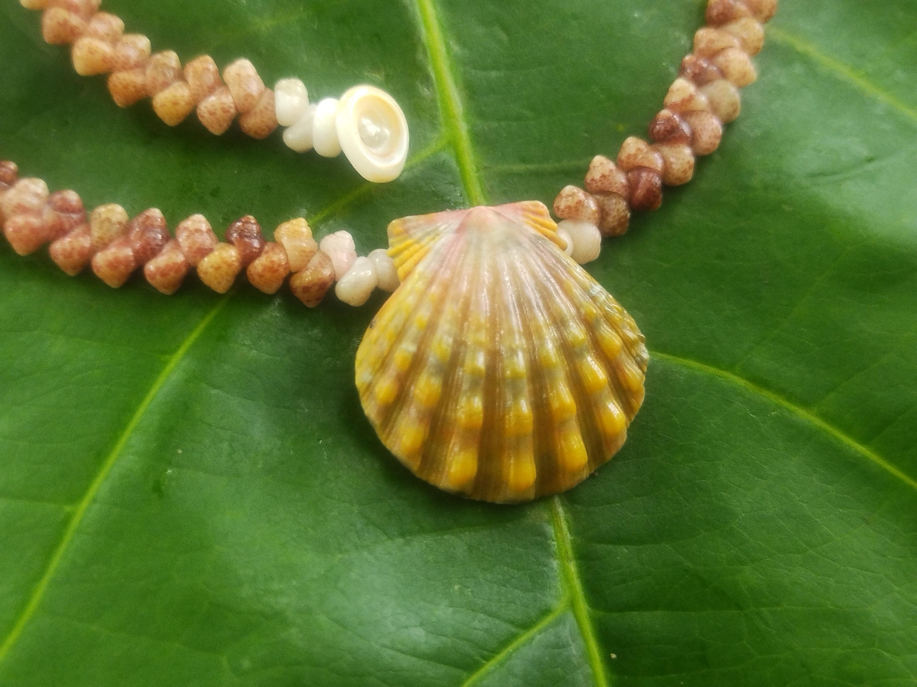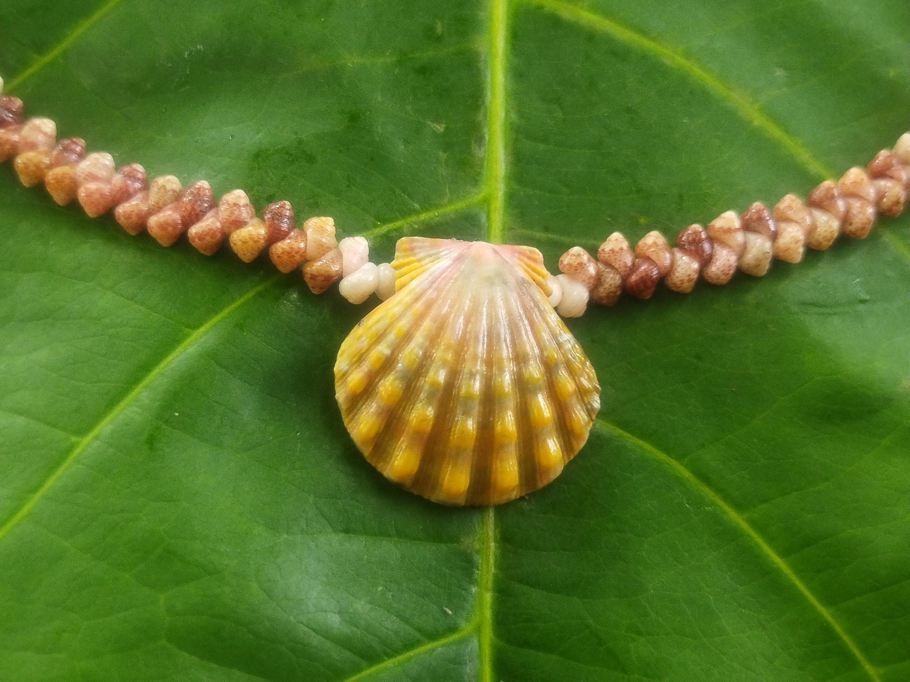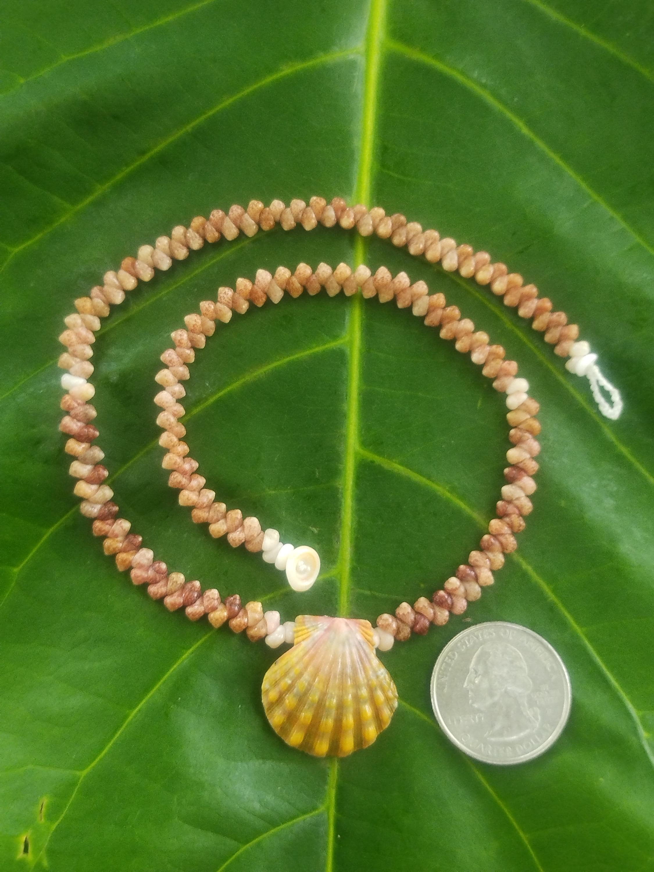 This classic Hawaiian Sunrise Shell is very high quality with strong ridges and both it's wings in tact. The colors on this shell are 100% natural, just as it was found on the shores of Kauai, Hawaii. The Sunrise shells and the Kahelelani shells were only worn by the royalty in the old Hawaiian days and were highly regarded for their beauty and rarity. Today they are extremely hard to find, being one of the most sought after and valuable shells in the ocean. This traditional Ni'ihau herringbone design is very versatile, comfortable, and durable.
