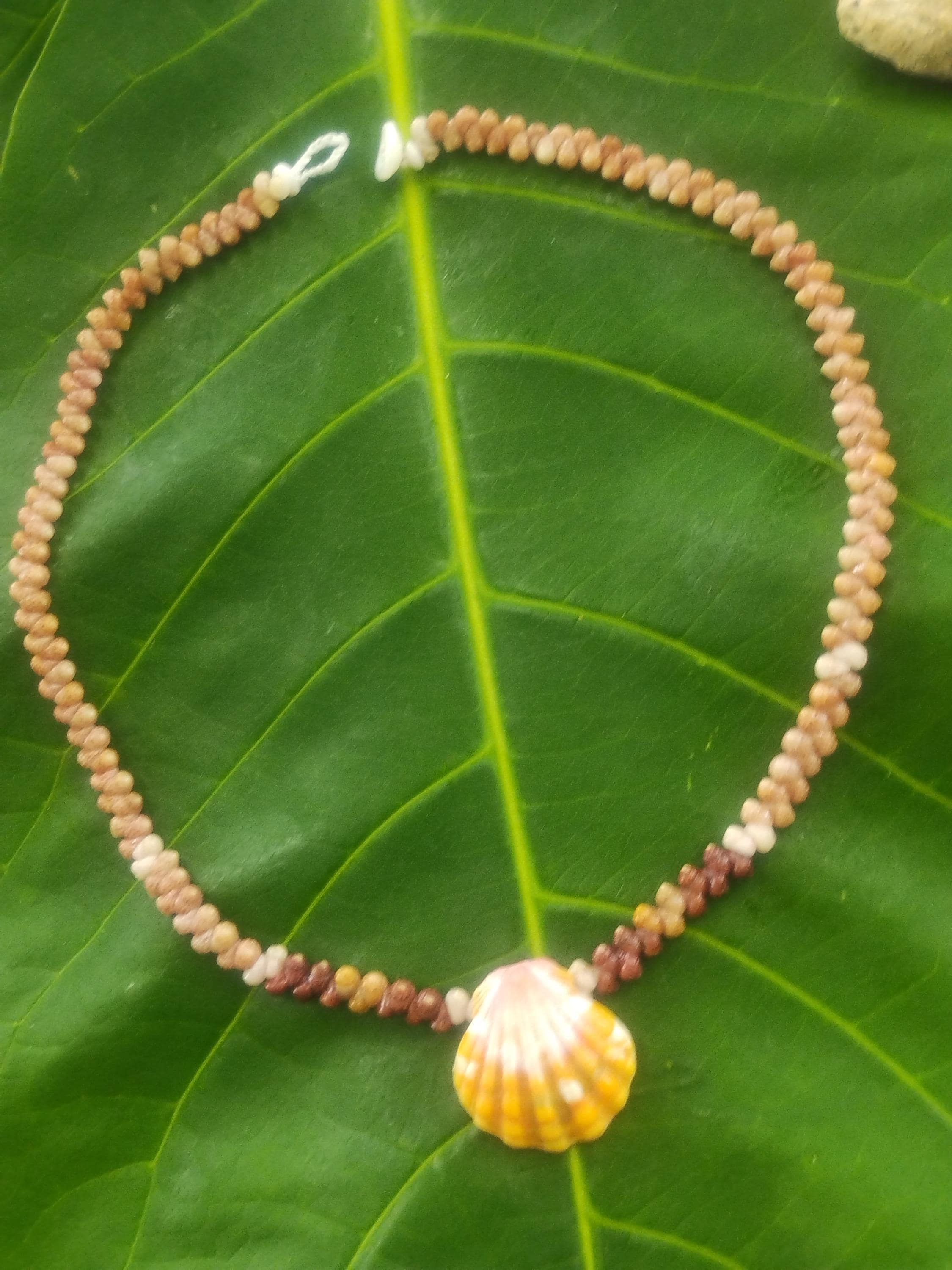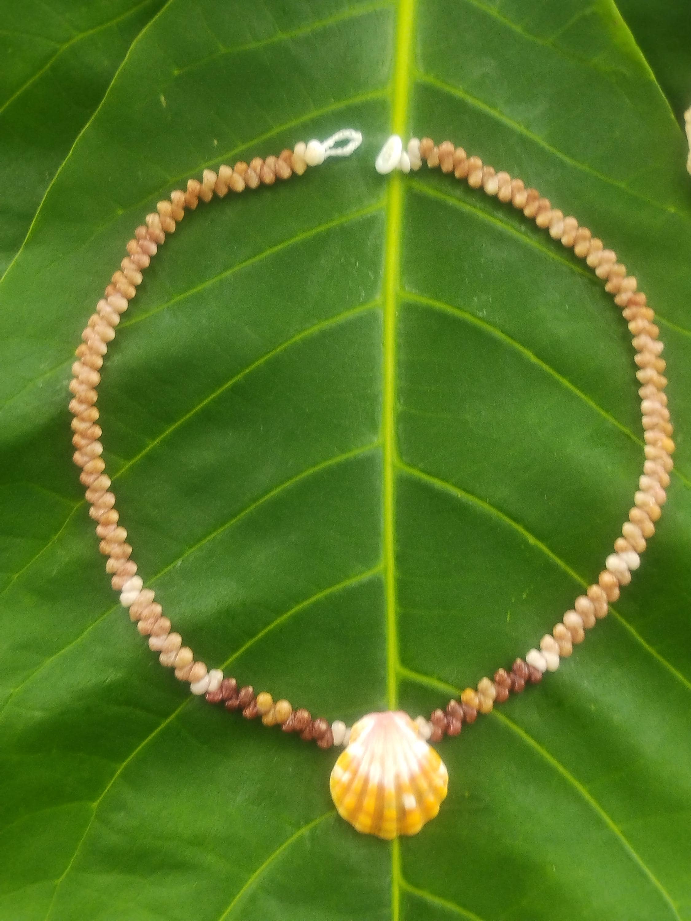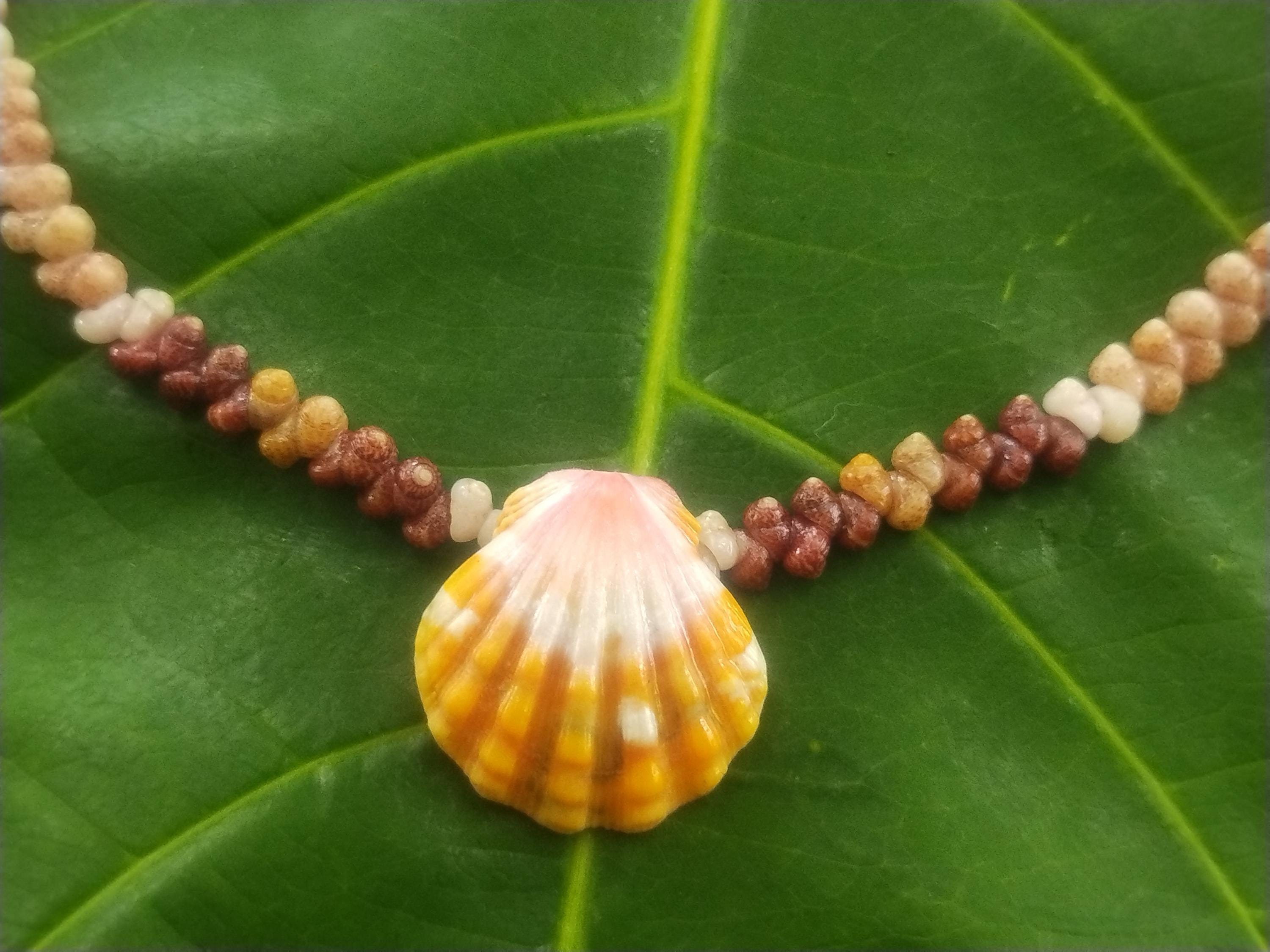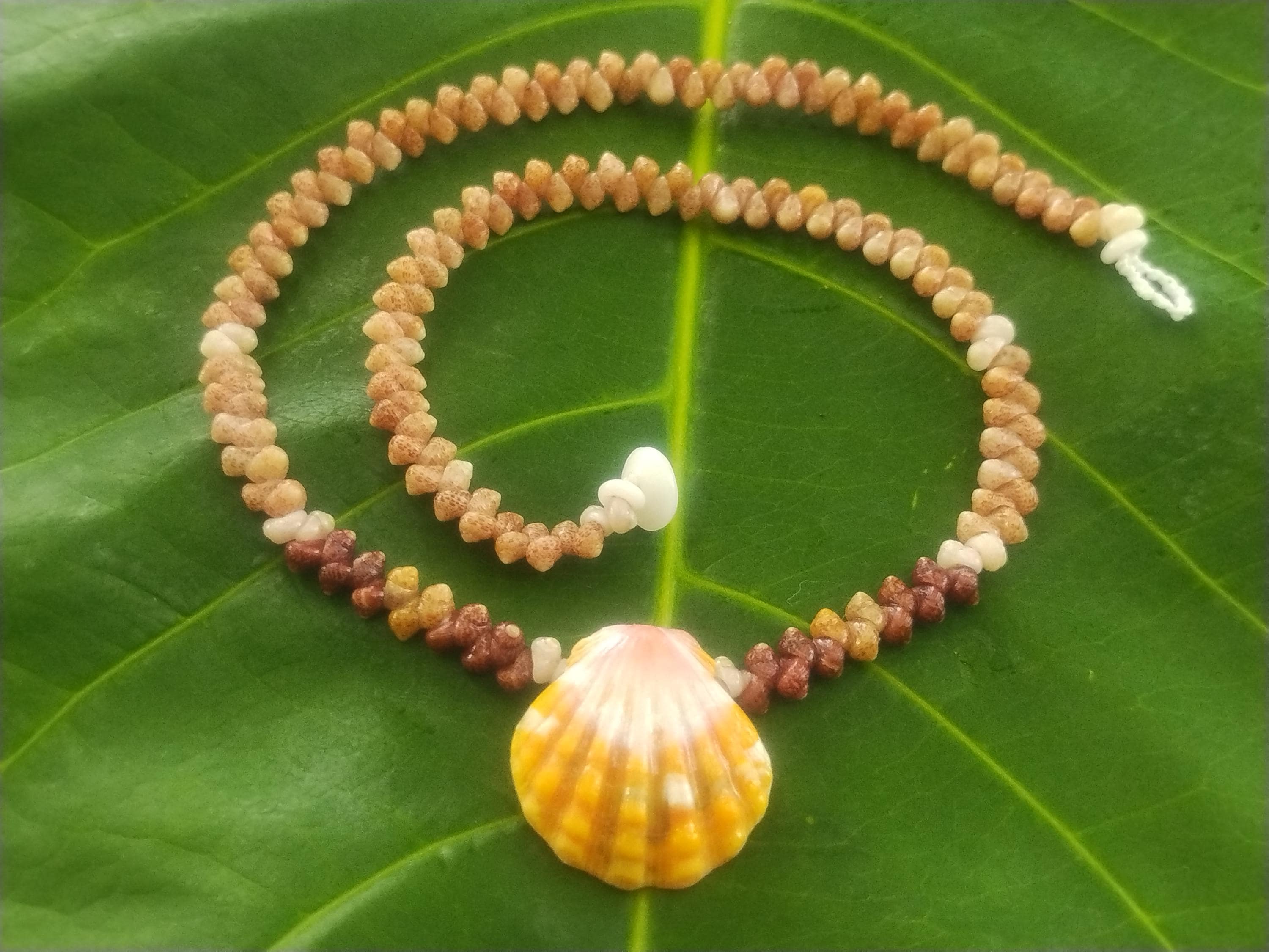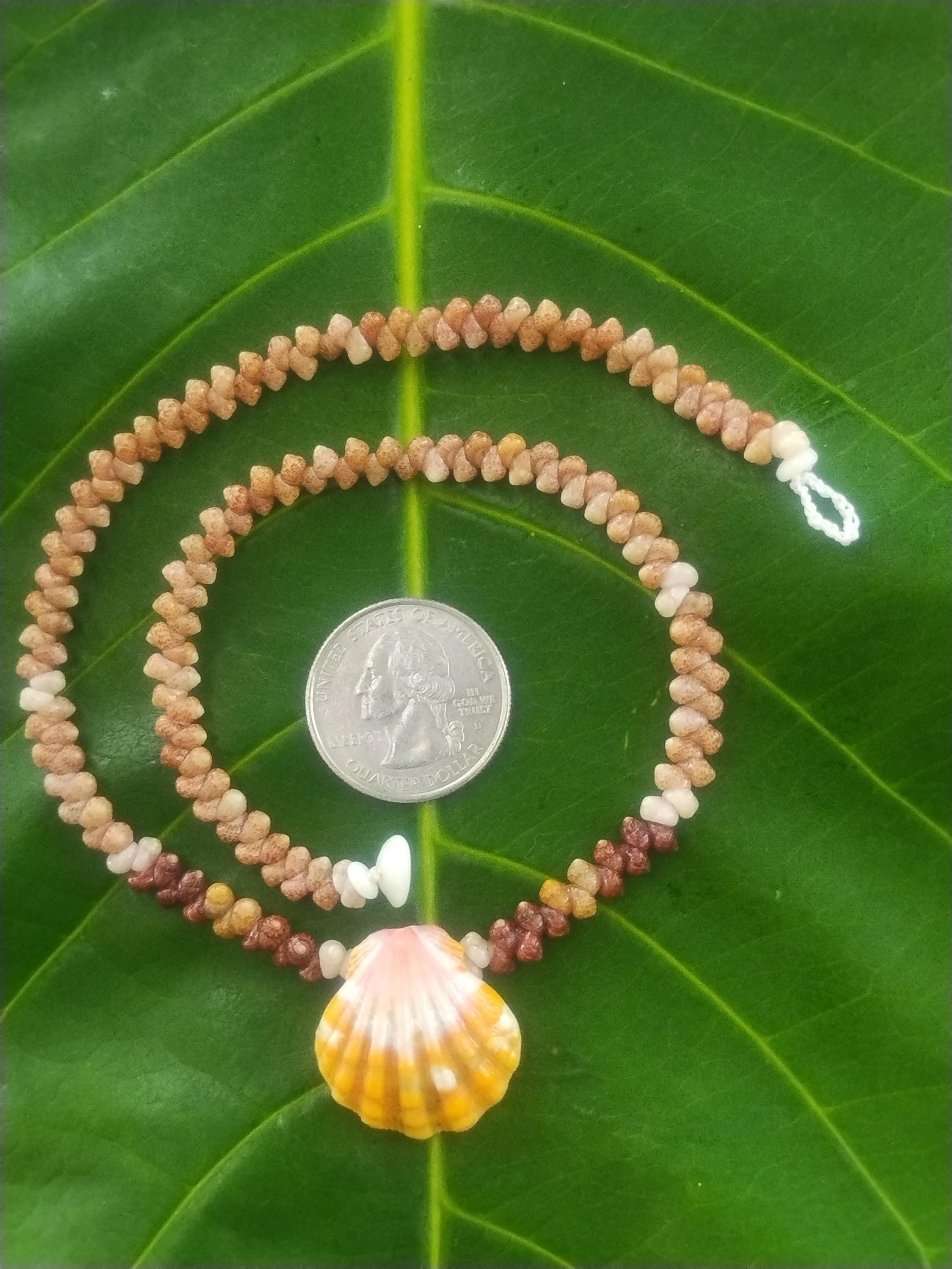 This classic Hawaiian Sunrise Shell is very high quality with strong ridges and both it's wings in tact. The colors on this shell are 100% natural, just as it was found on the shores of Kauai, Hawaii. The Sunrise shells and the Kahelelani shells were only worn by the royalty in the old Hawaiian days and were highly regarded for their beauty and rarity. Today they are extremely hard to find, being one of the most sought after and valuable shells in the ocean. This traditional Ni'ihau herringbone design is very versatile, comfortable, and durable.
