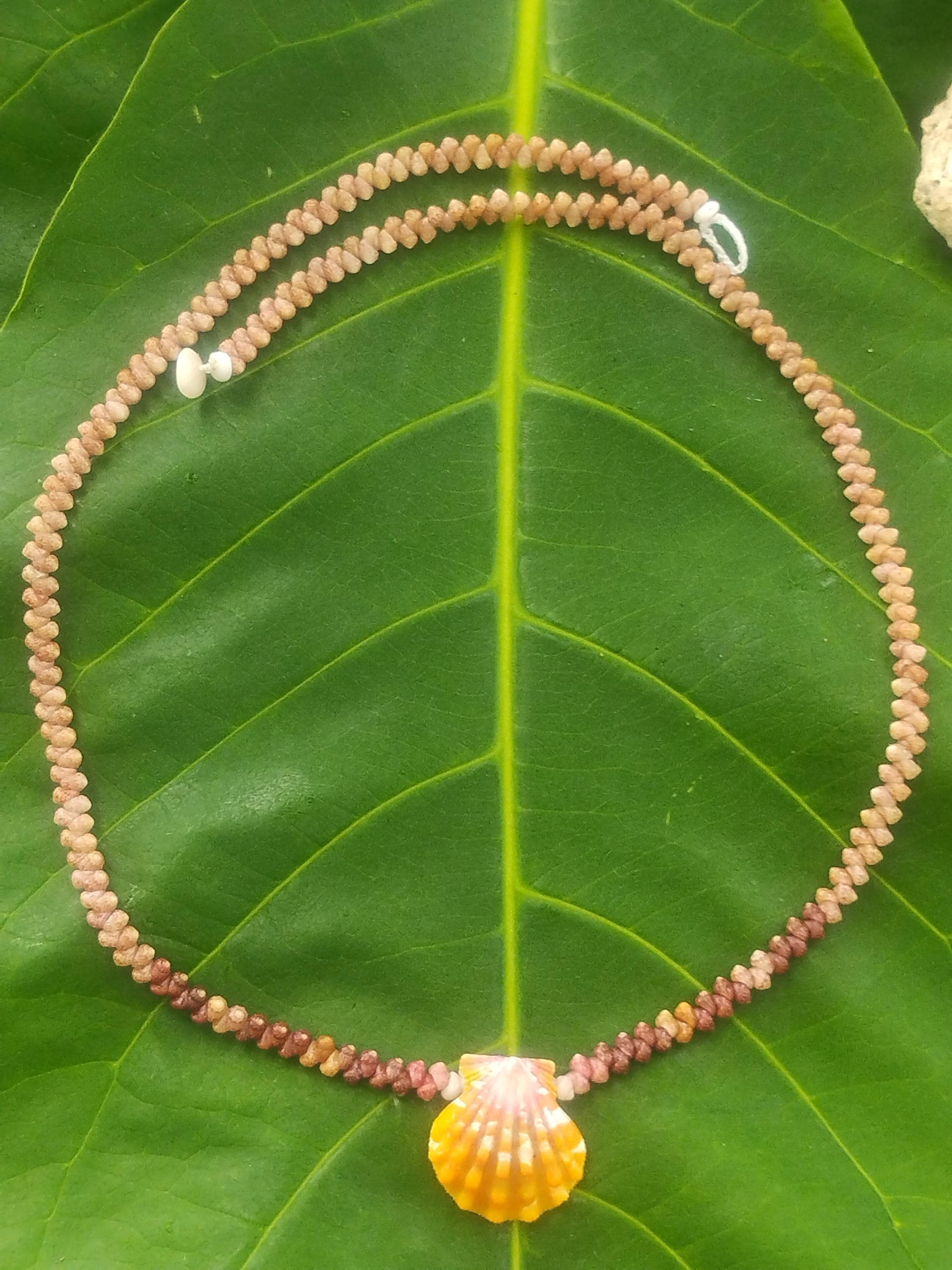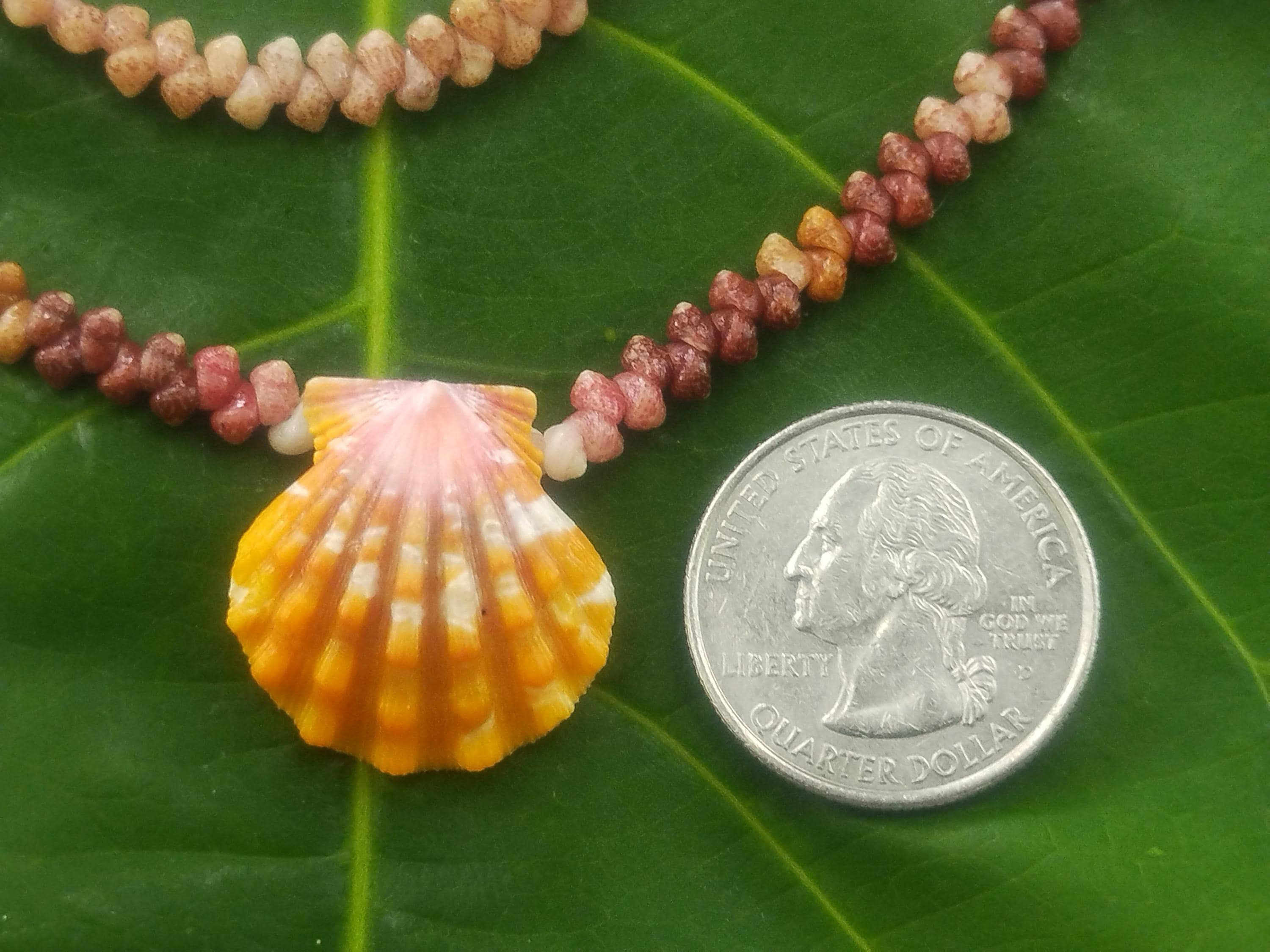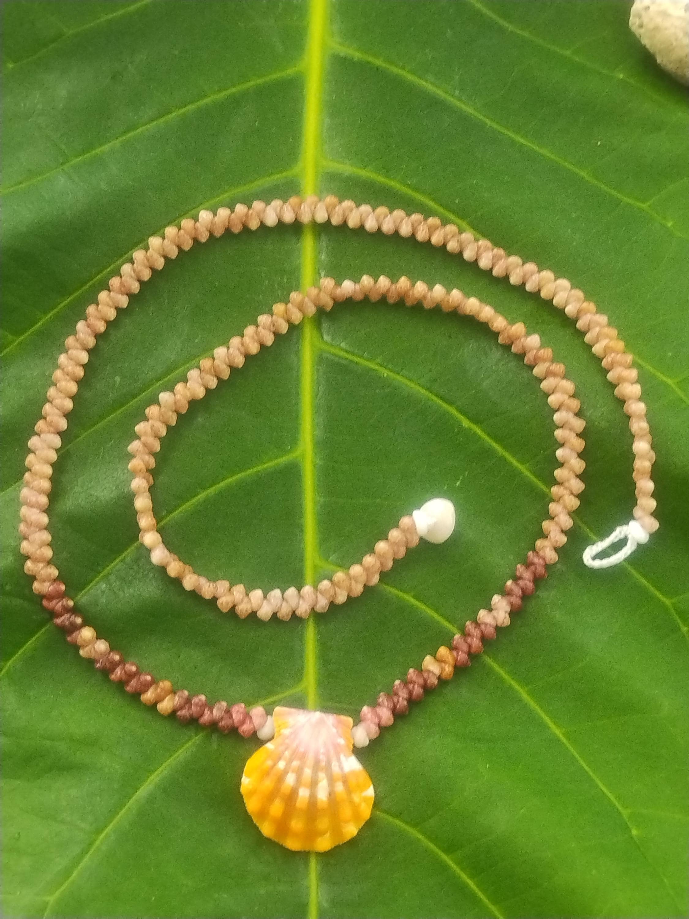 This classic Hawaiian Sunrise Shell is very high quality with strong ridges and both it's wings in tact. The colors on this shell are 100% natural, just as it was found on the shores of Kauai, Hawaii. The Sunrise shells and the Kahelelani shells were only worn by the royalty in the old Hawaiian days and were highly regarded for their beauty and rarity. Today they are extremely hard to find, being one of the most sought after and valuable shells in the ocean. This traditional Ni'ihau herringbone design is very versatile, comfortable, and durable.