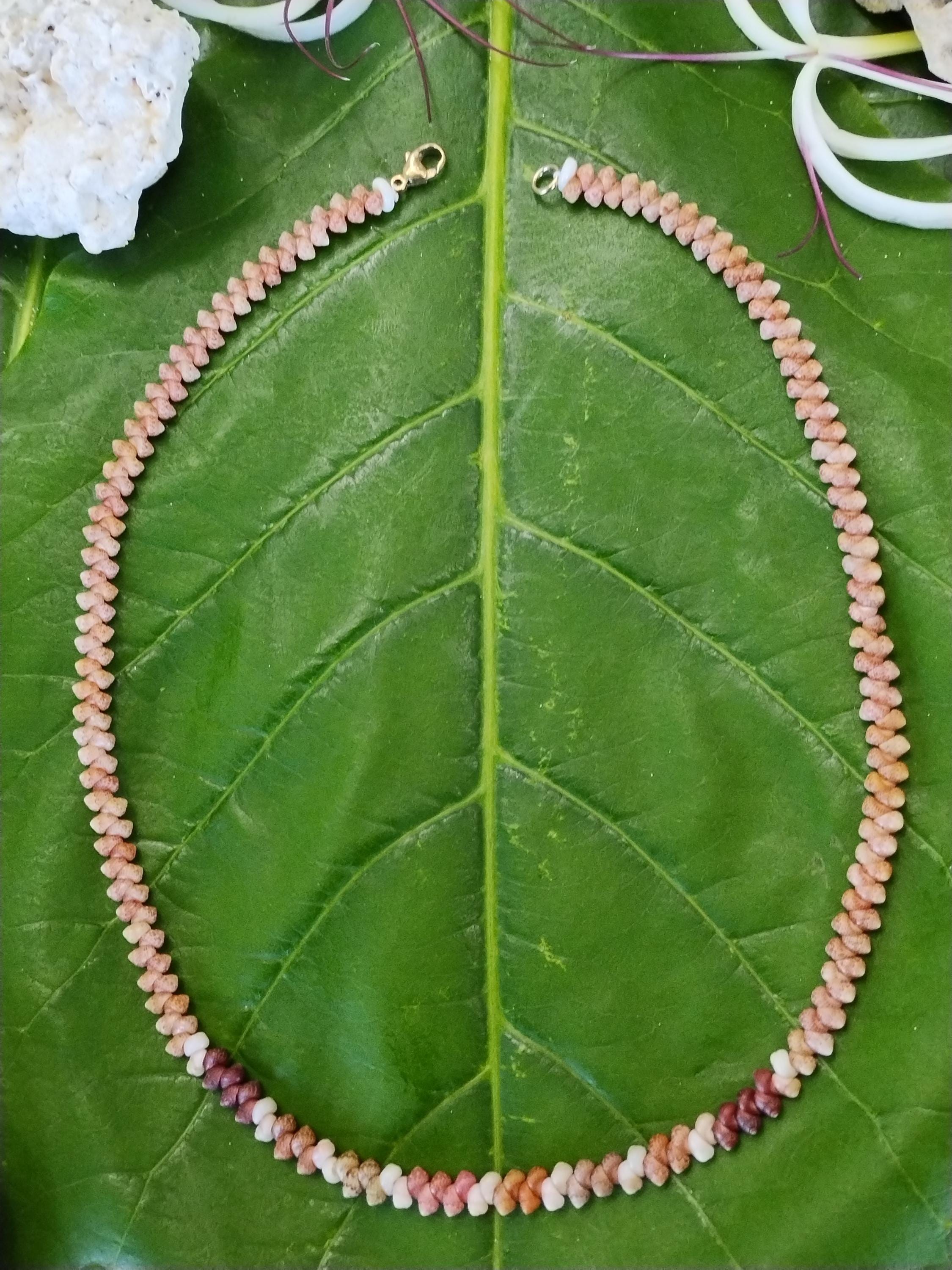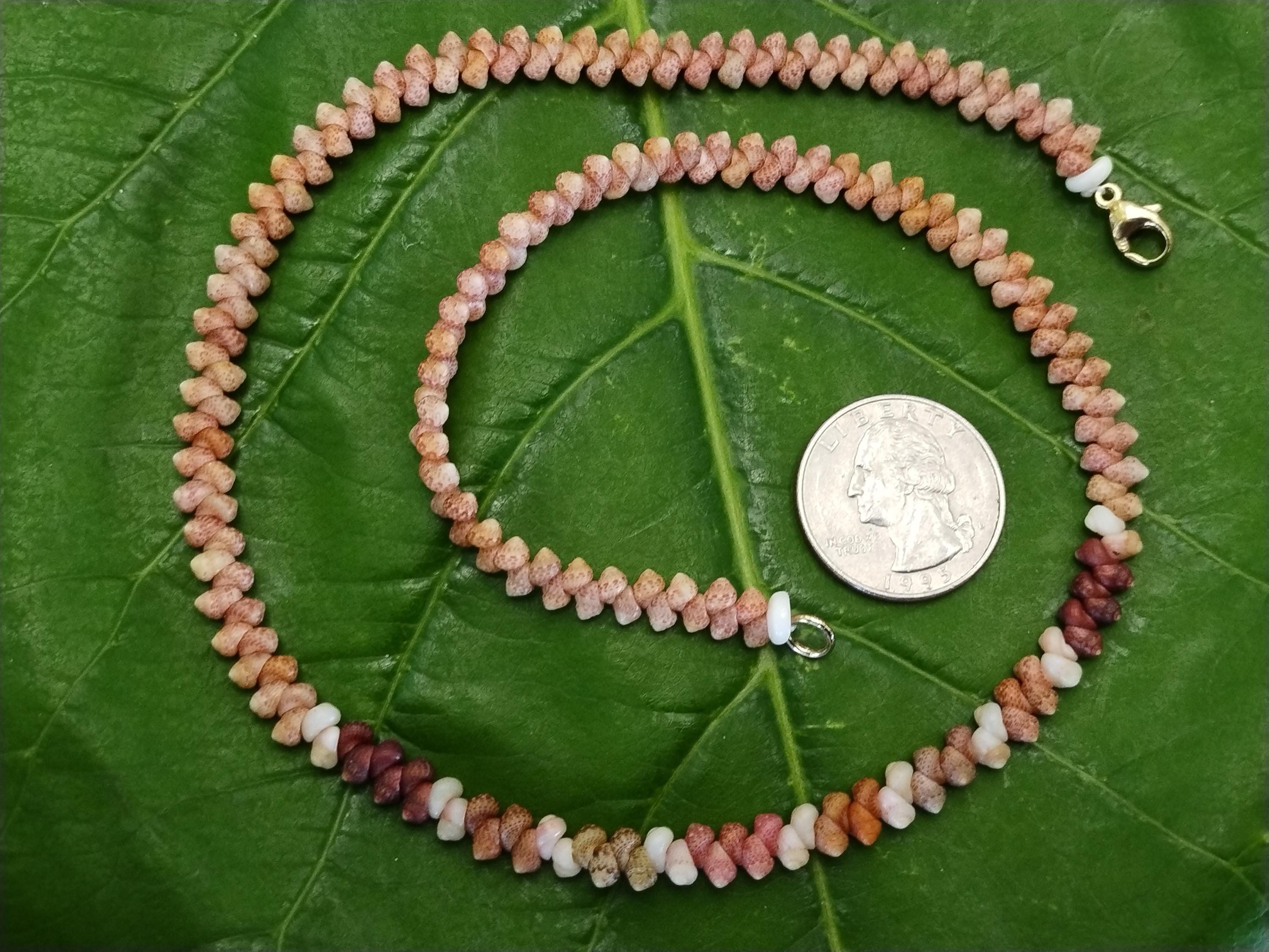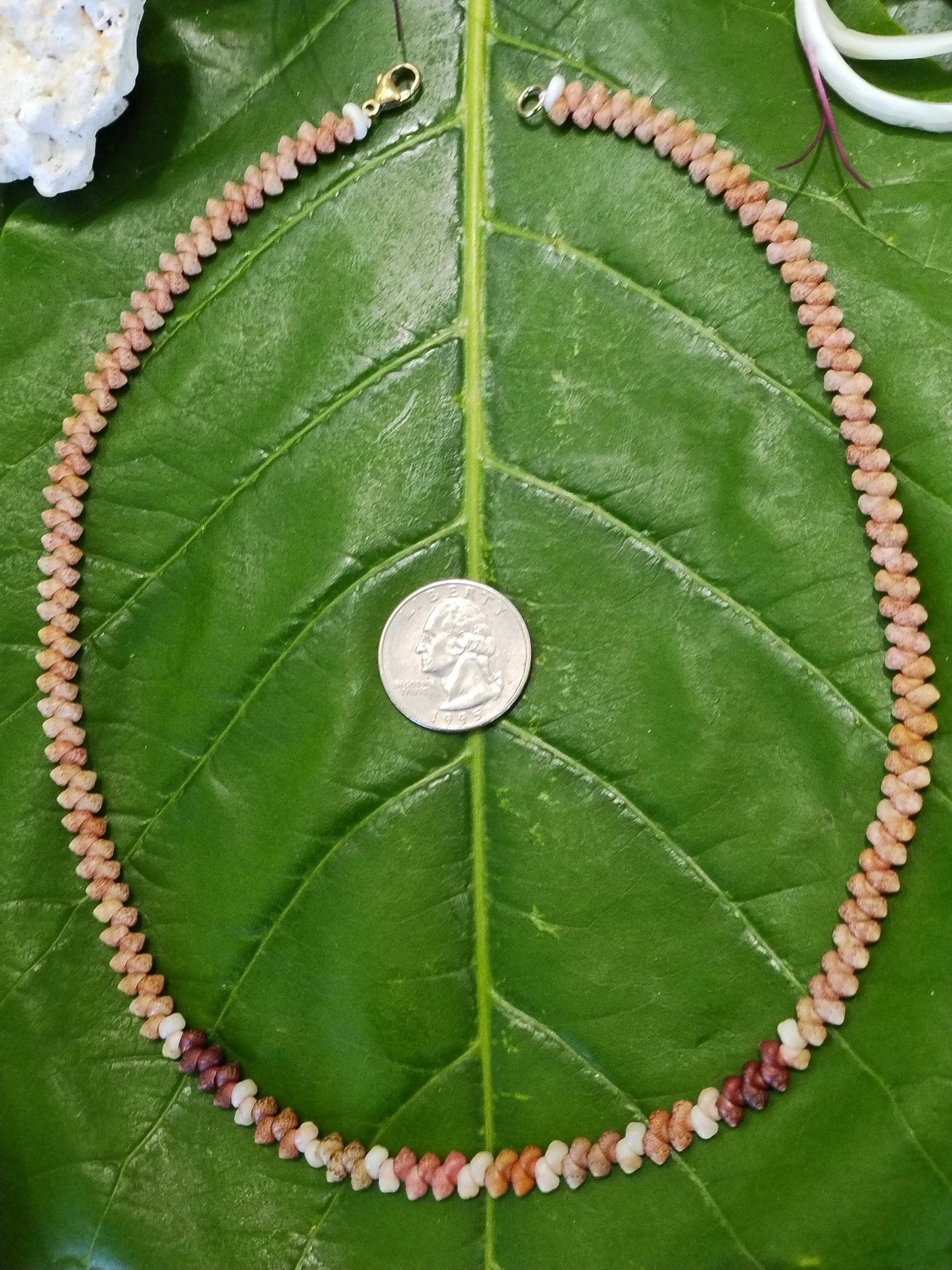 This necklace is made with large size Kahelelani shells all hand picked from the beaches of Kauai, Hawaii. The Kahelelani shells are only found on a few select beaches in Hawaii, and nowhere else in the world. This ancient art form originated on the forbidden Island of Ni'ihau. These are some of the most rare and valuable shells in existence today. This jewelry will continue to gain in value, as the shells are washing in fewer each year due to pollution in our oceans.