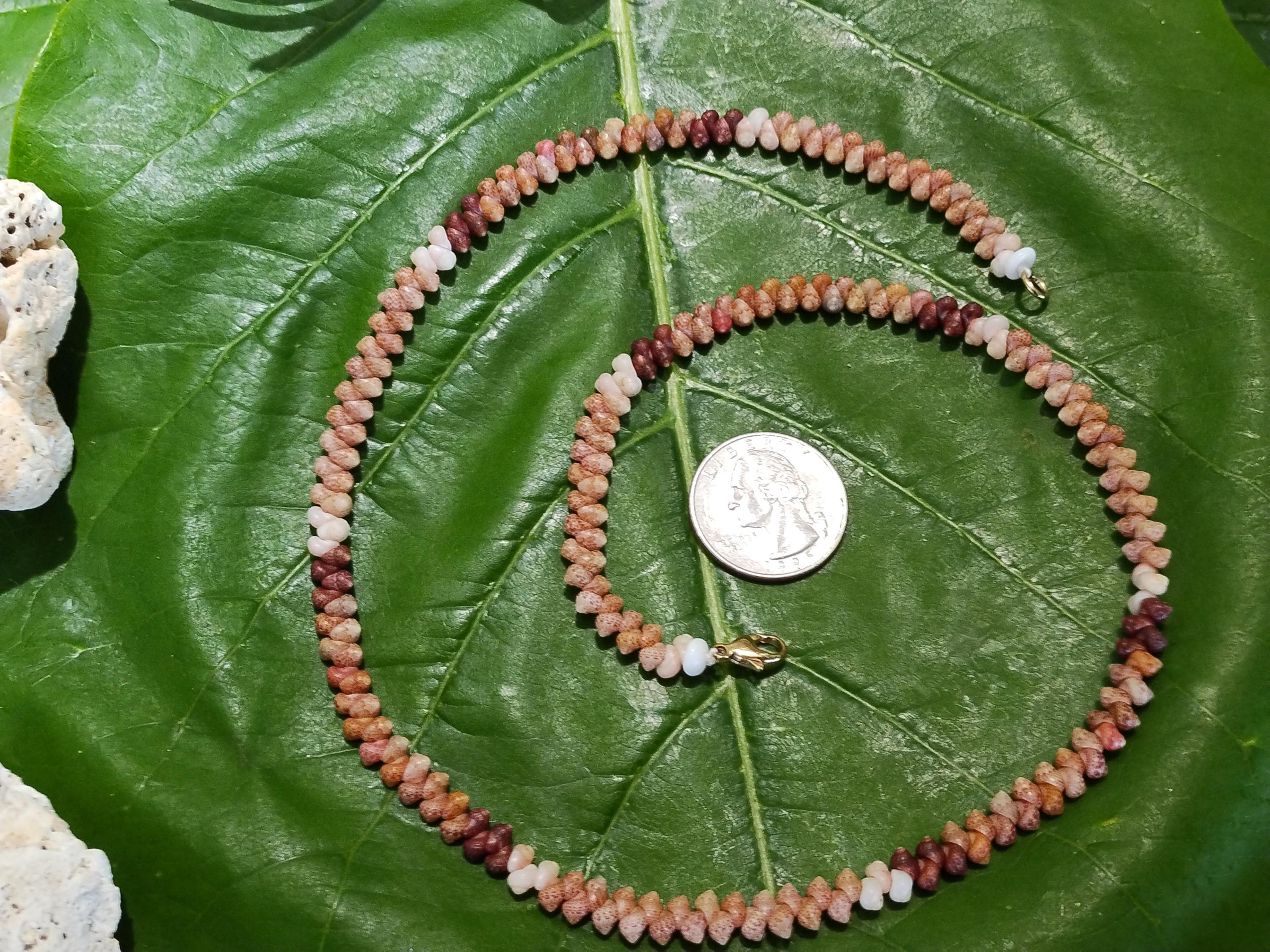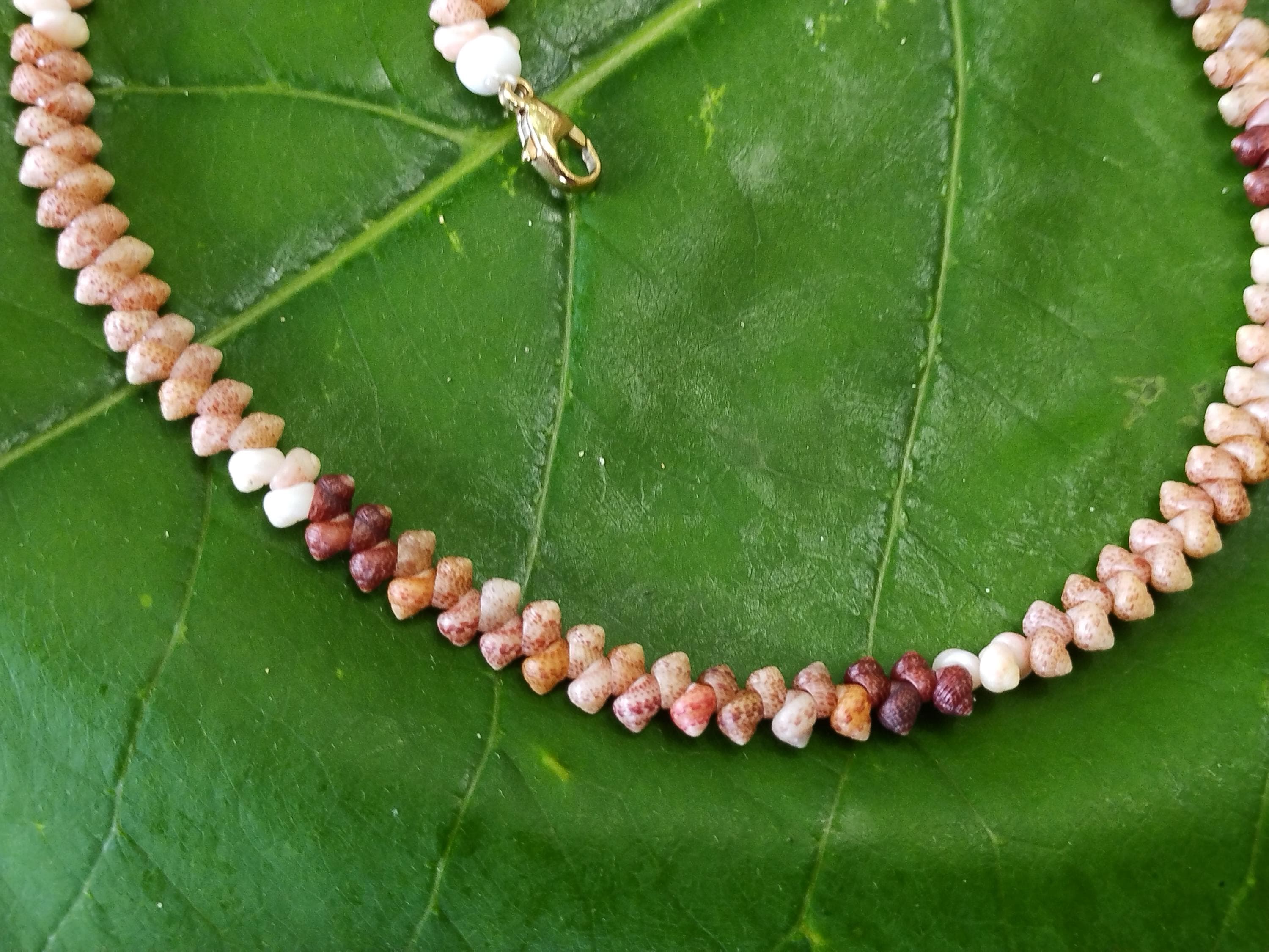This necklace is made with large size Kahelelani shells all hand picked from the beaches of Kauai, Hawaii. The Kahelelani shells are only found on a few select beaches in Hawaii, and nowhere else in the world. This ancient art form originated on the forbidden Island of Ni'ihau. These are some of the most rare and valuable shells in existence today. This jewelry will continue to gain in value, as the shells are washing in fewer each year due to pollution in our oceans.