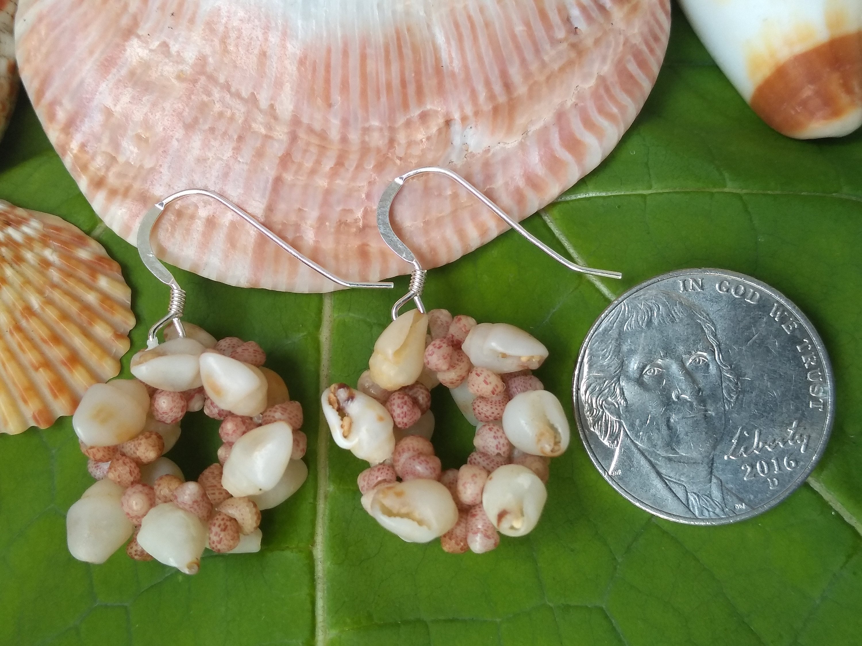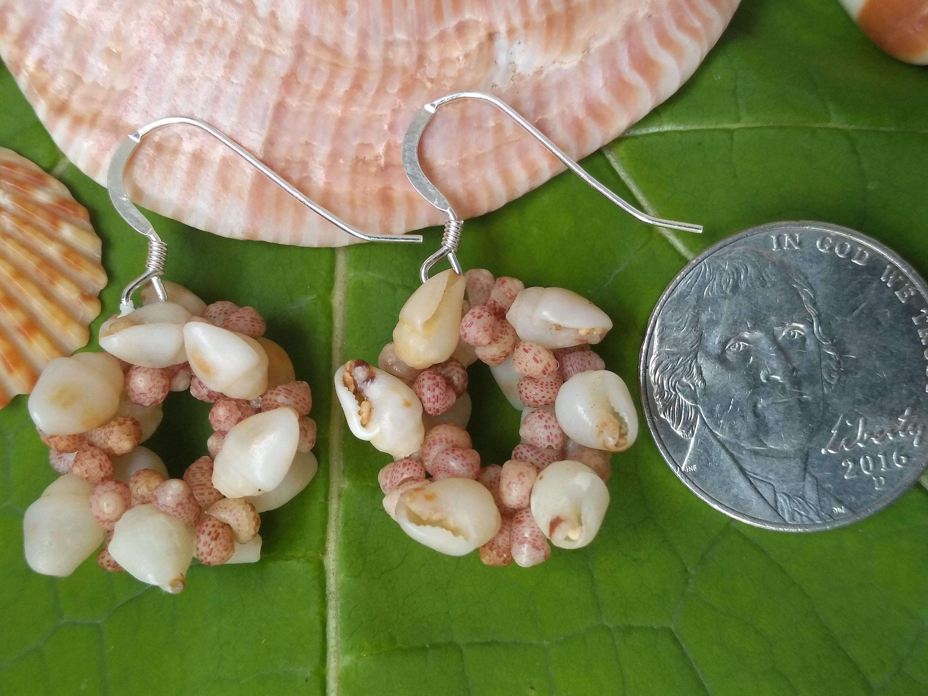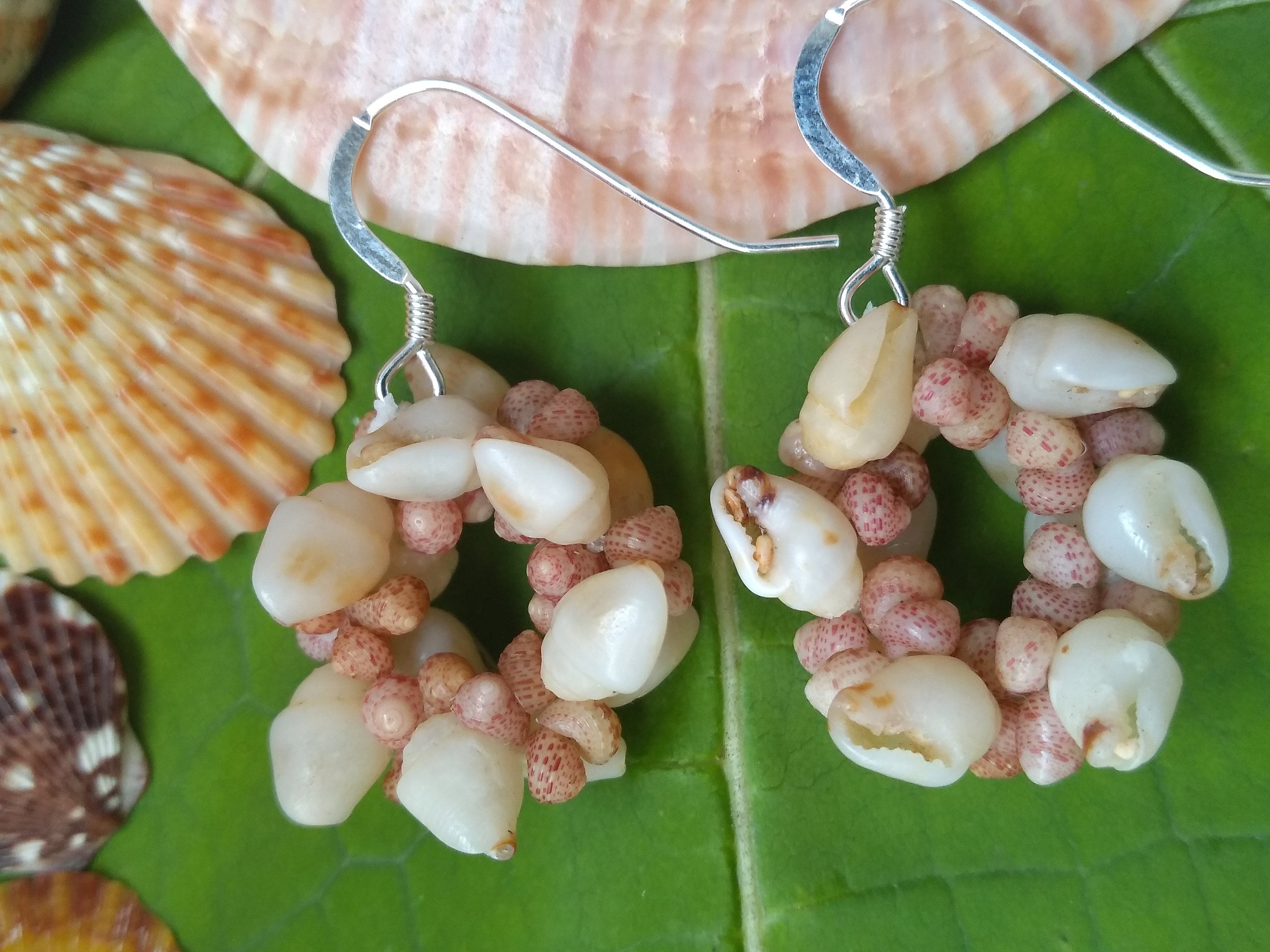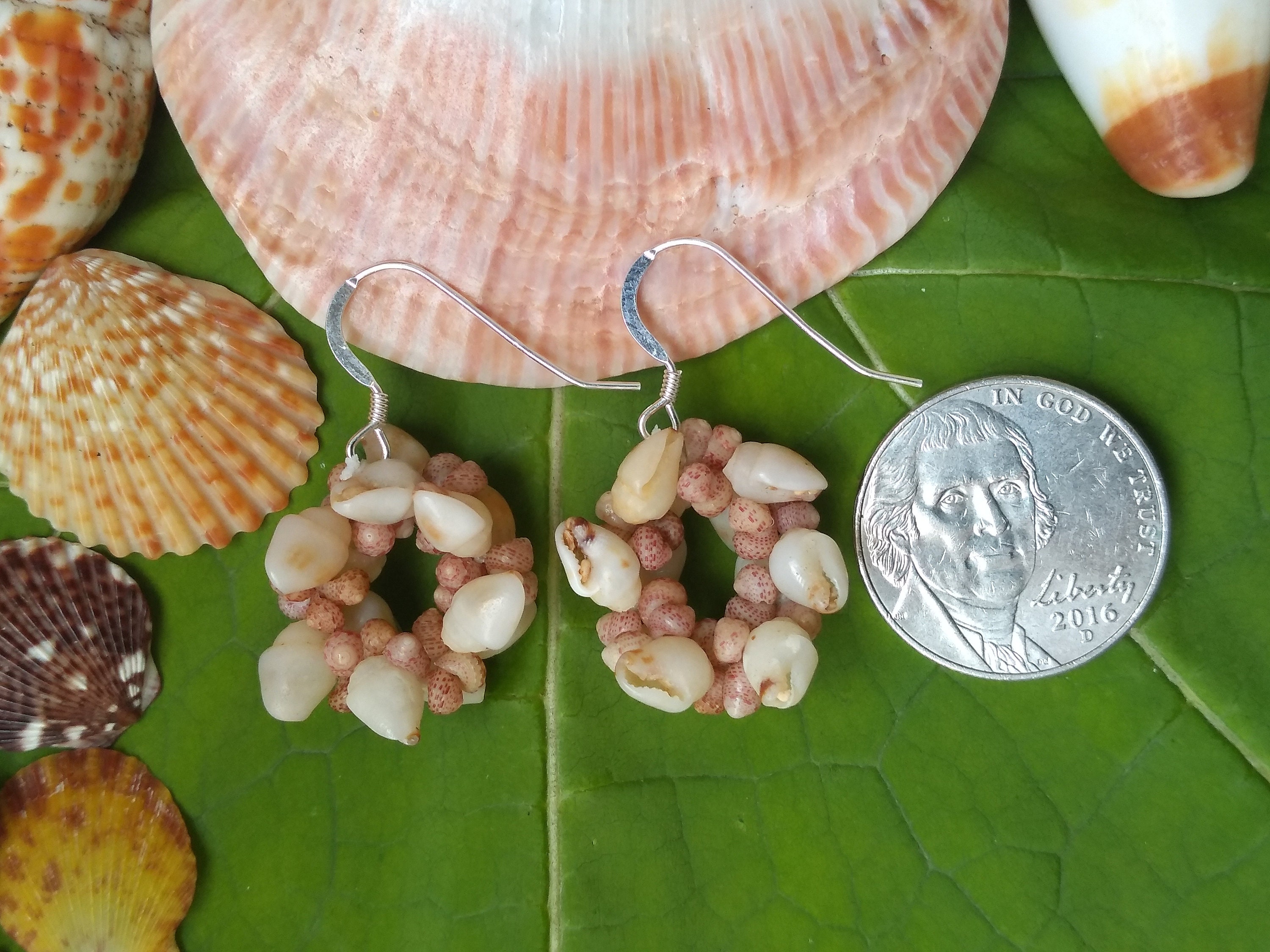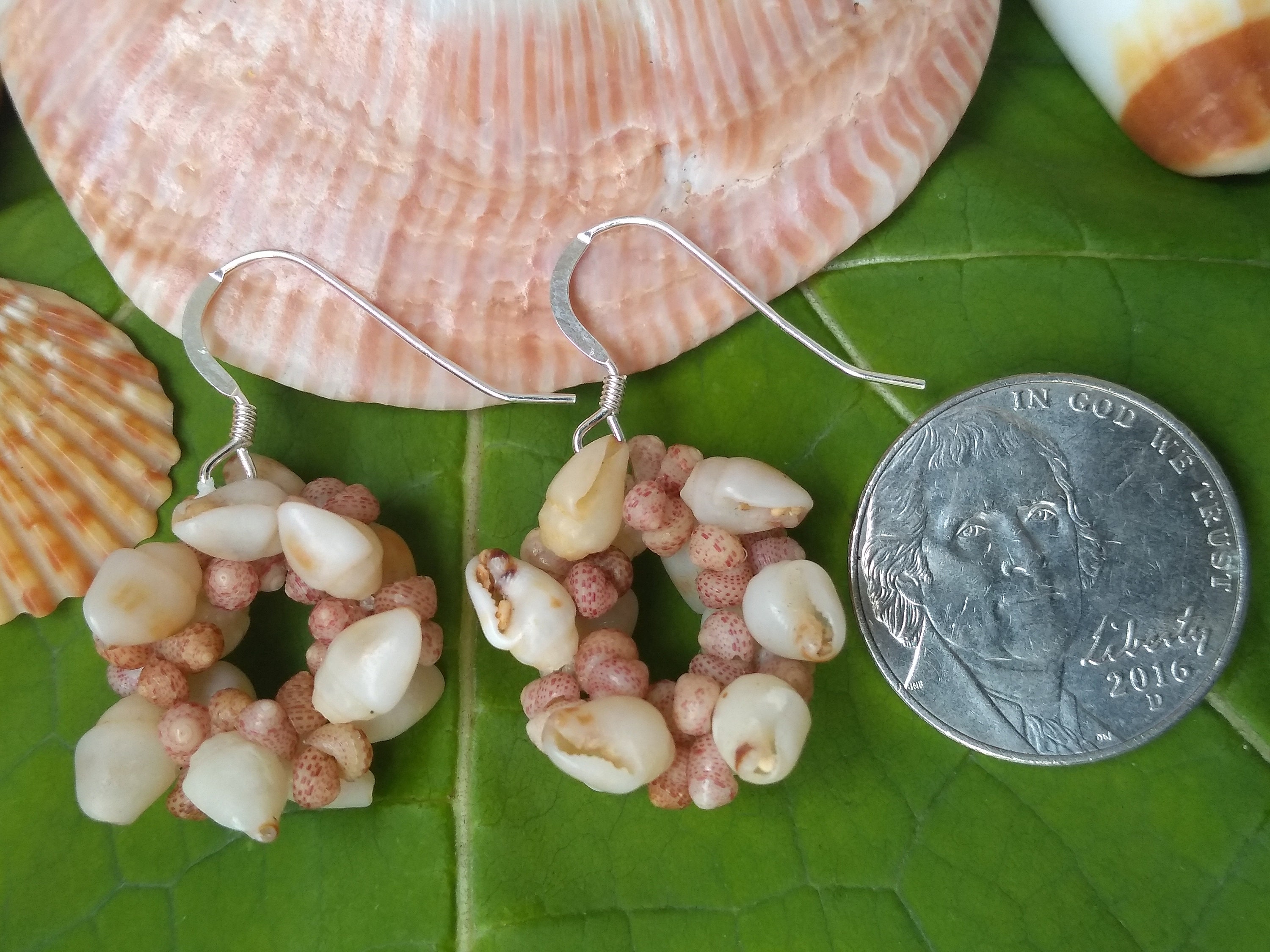 These earring are made using some of the most rare and valuable shells on Earth. The Momi shells (larger white) and the Kahelelani shells are known as "Niihau" shells, after the Island just Northwest of Kauai that has made these shells famous. They are so rare in fact, that they are the ONLY shells in the world that are actually insurable as GEMS! I hand picked each one of these shells from the beaches of Kauai, hand drilled each one, and strung them in a tradition weave unique to the Hawaiian Islands. These earrings create a very elegant one-of-a-kind look to any style. They are very popular here on the Islands. They are strung on 40lb' test braided nylon line so they are very strong and durable and can be worn in fresh or salt water. They are on sterling silver ear wires.